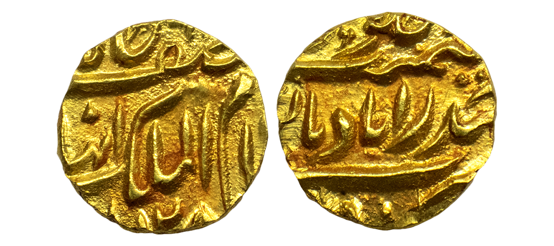 Hyderabad State, Afzal ud-Daula (AH 1273-1285/1857-1869 AD) ¼ Ashrafi, 2.75 gms, Farkhanda Bunyad Haidarabad Mint, AH 1278, Obv: Persian legend "sikka nizam-ul-mulk bahadur asif jah" with complete Hijri year 1279, Rev: Persian legend "sana julus" & "zarb Haidarabad" with the epithet "Farkhanda Bunyad", Variant of KM # Y 9, uncirculated, very rare