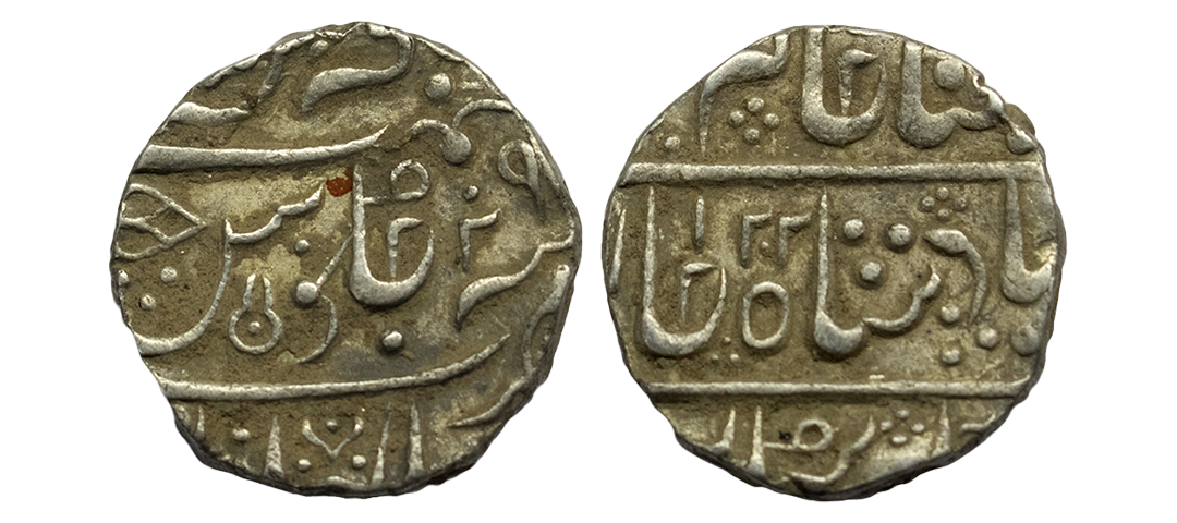Indian Princely States, Gwalior State, Baija Bai (AH 1243-1249, 1827-1833 AD), INO Muhammad Akbar II (AH 1221-1253, 1806-1837 AD), Silver Rupee, 10.95 gms, Lashkar Mint, Frozen RY 23, “Shri” in Nagari & five flowered symbol, KM # 65, very fine+, very scarce.