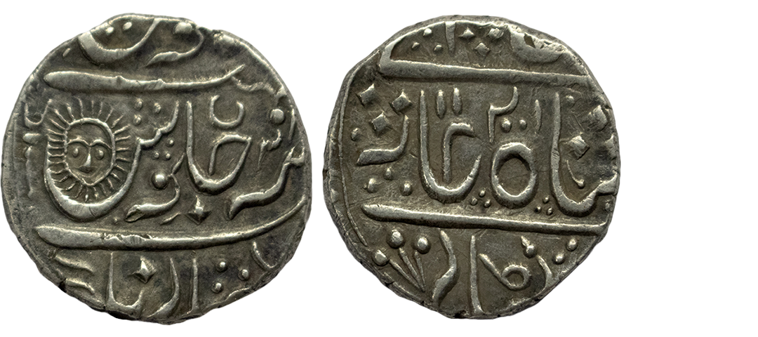 Indian Princely States, Gwalior State, Baija Bai (AH 1243-1249, 1827-1833 AD), INO Muhammad Akbar II (AH 1221-1253, 1806-1837 AD), Silver Rupee, 10.95 gms, Lashkar Mint, Frozen RY 23, “Shri” in Nagari & five flowered symbol, KM # 65, very fine+, very scarce.