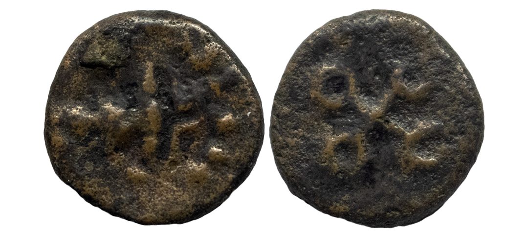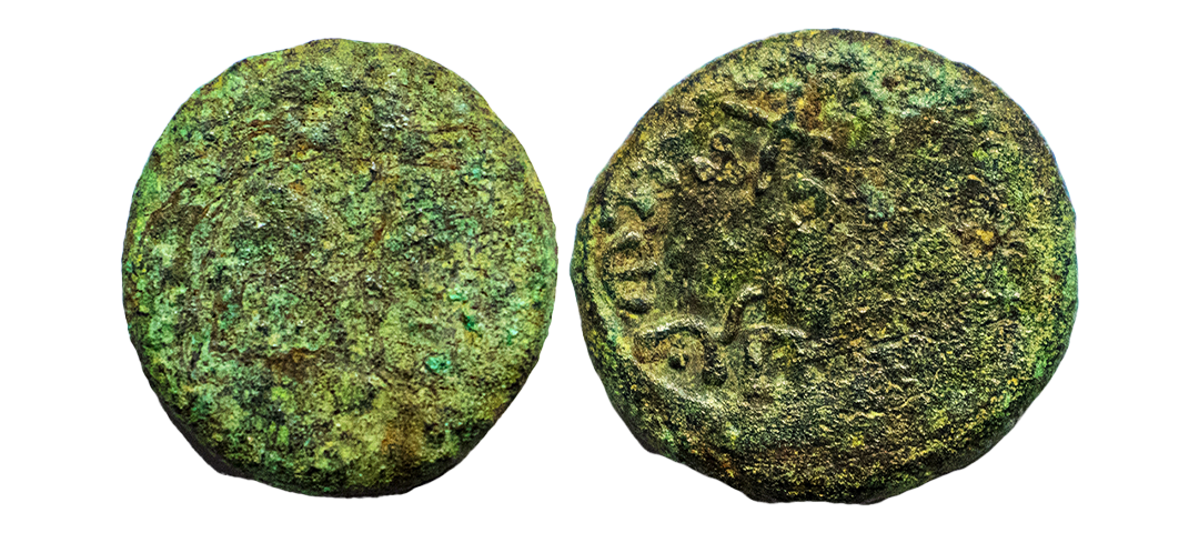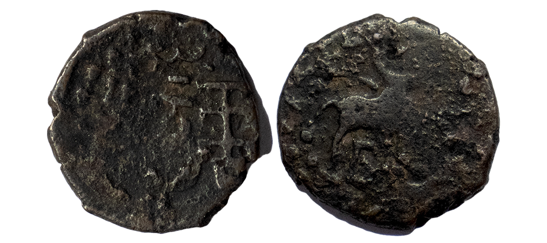 Ancient, Post Mauryan Almora region, Bhanumitra (1st Century AD), Copper Unit, 3.47 gms, Obv: Above Brahmi legend ‘RajnoBhanumitasa’, Below Standing deity flanked by Tree in railing on right and Arched hill on left, Rev: Tree in railing, Pieper # 1677, pg. 258, very fine, extremely rare.