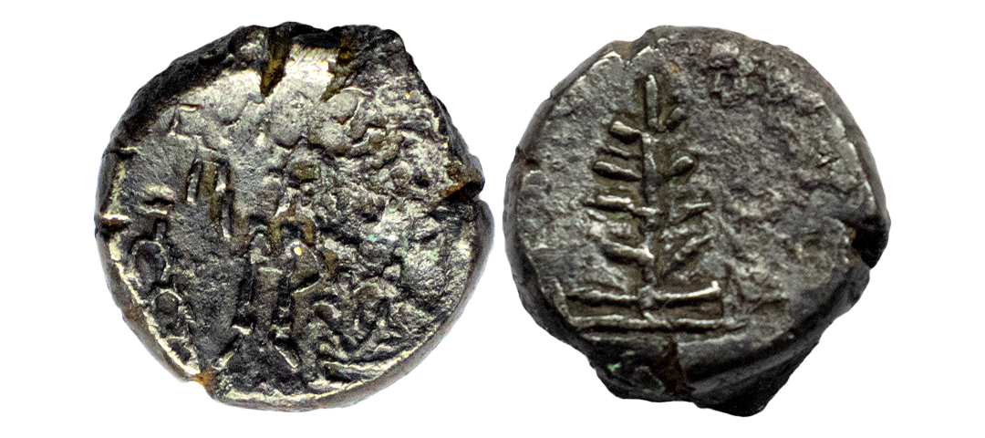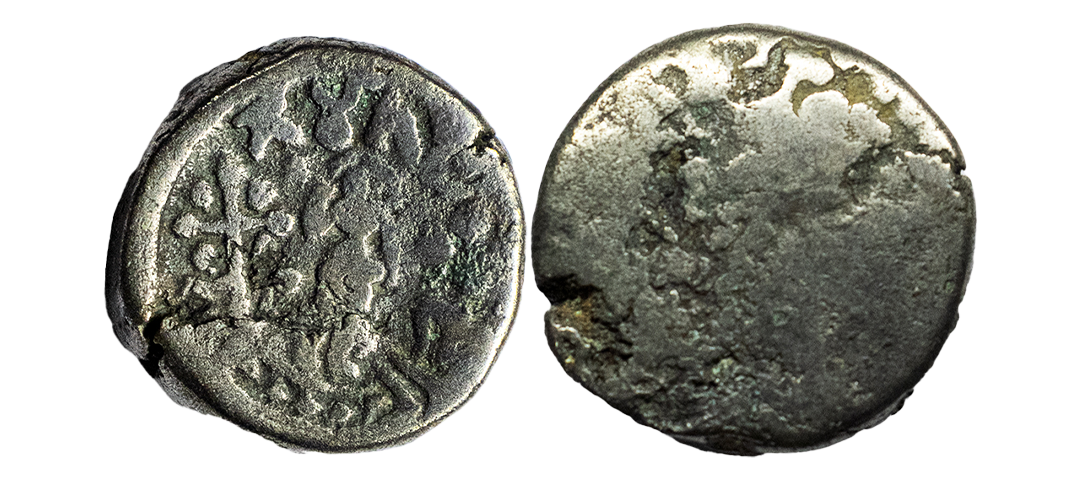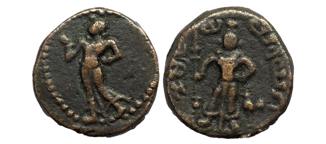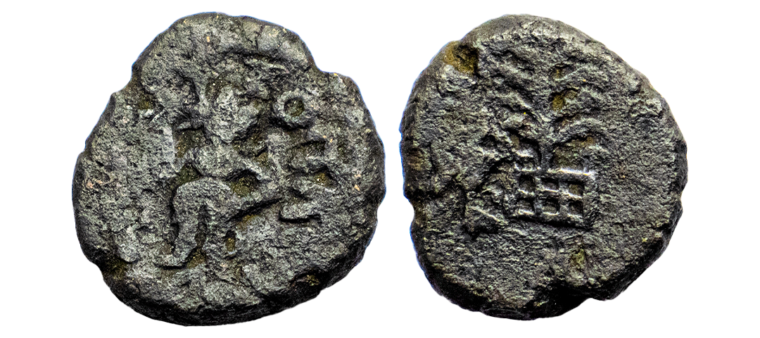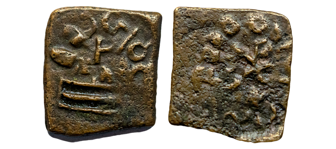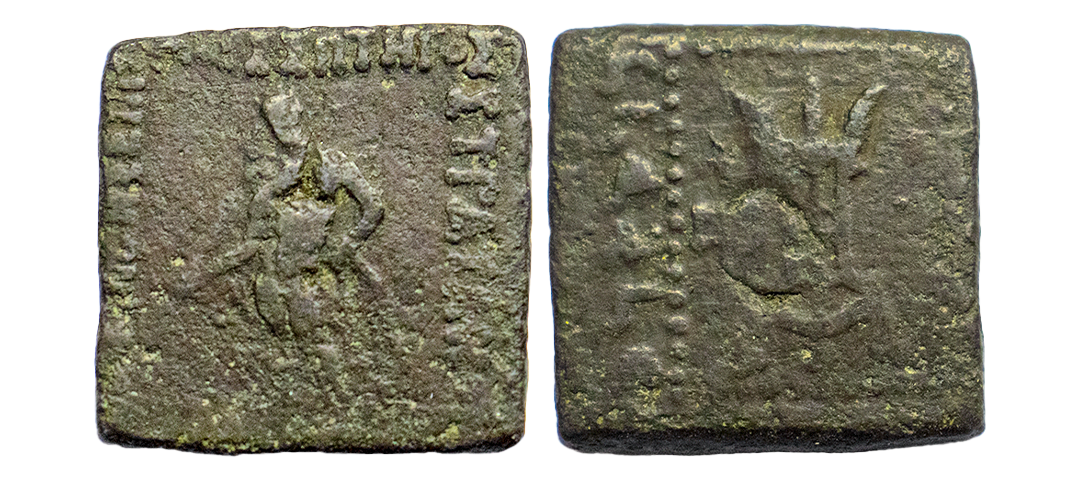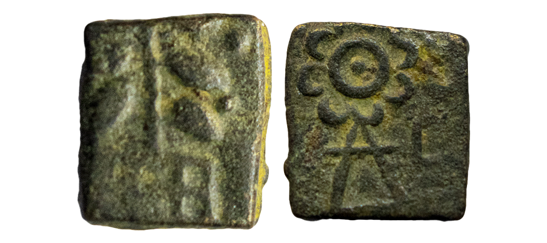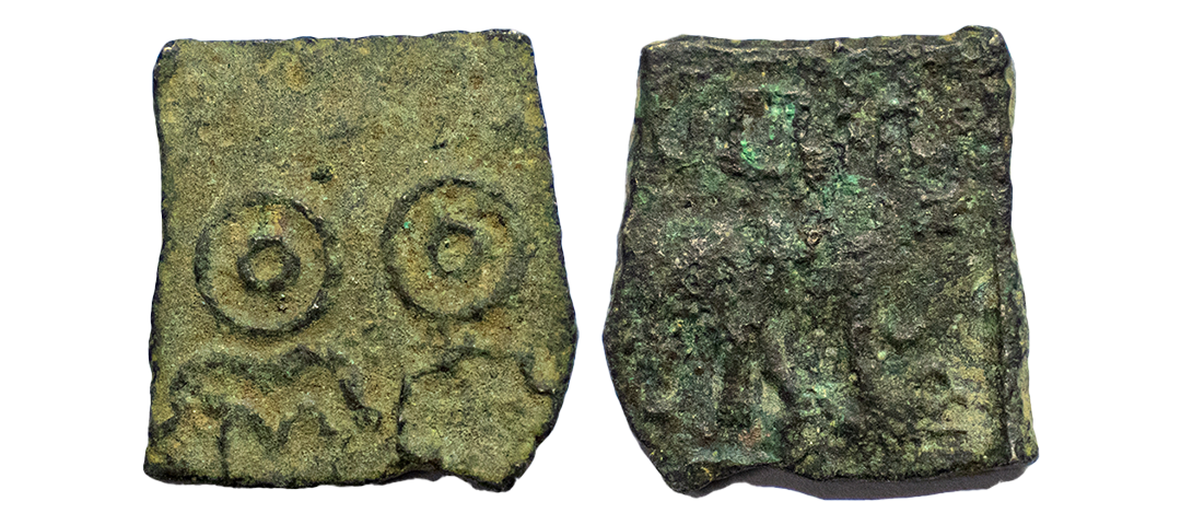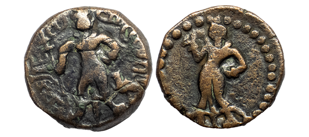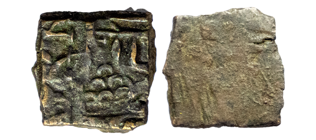 Ancient, Mathura region, Gomitra (2nd-1st Century BC), Billon Heavy Unit, 8.54 gms, Obverse: Standing deity Lakshmi, Tree at left, Shrivatsa and Ujjain symbols at right, Brahmi legend ’Gomitasa’ above, Reverse: Deity seated on a three headed elephant facing front, Pieper # 1261, pg. 191, fine to very fine, rare.