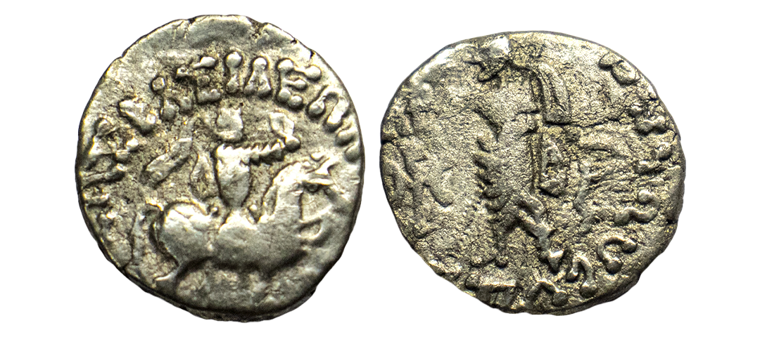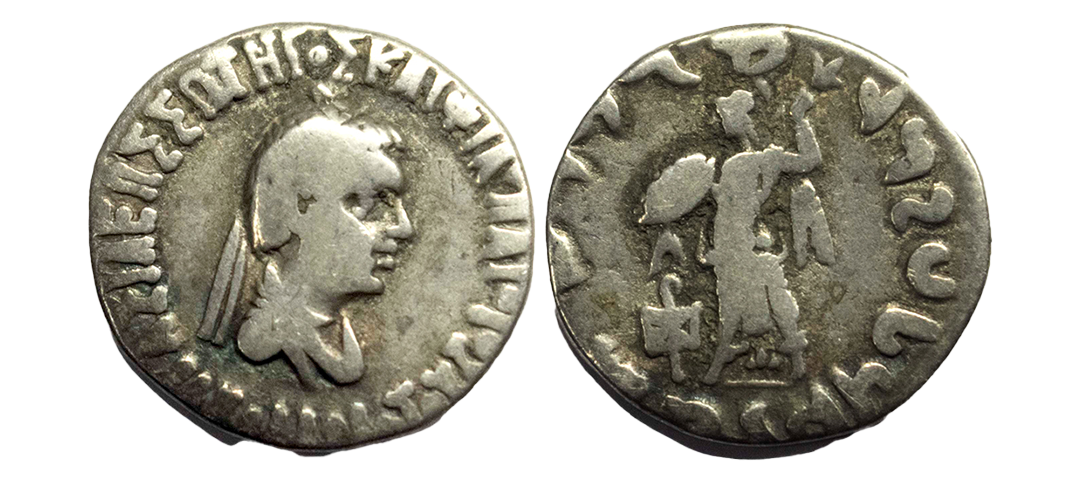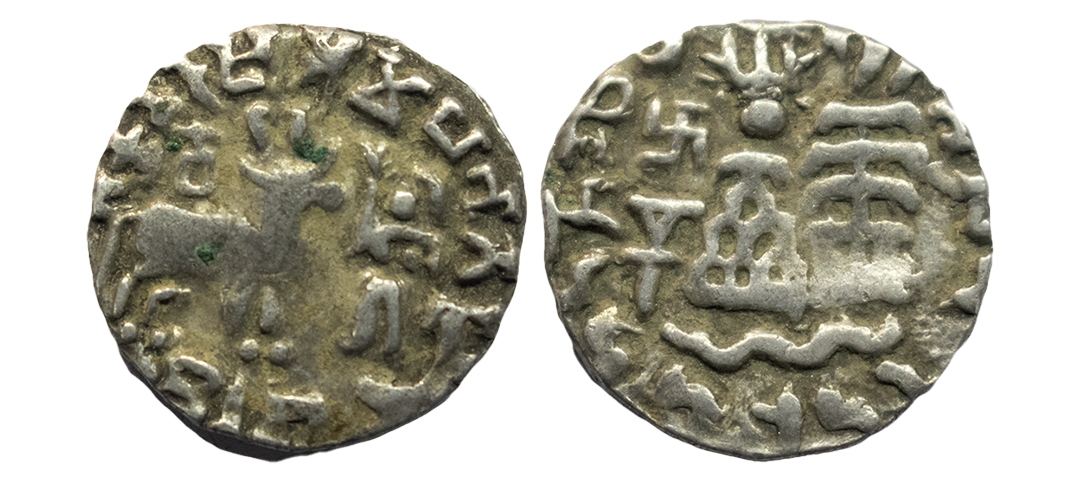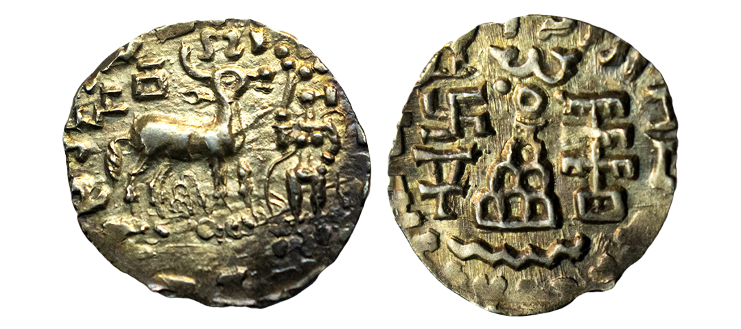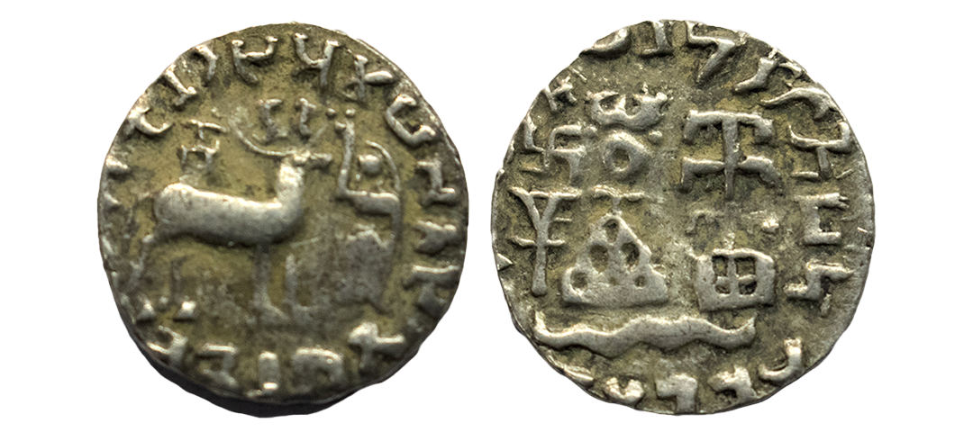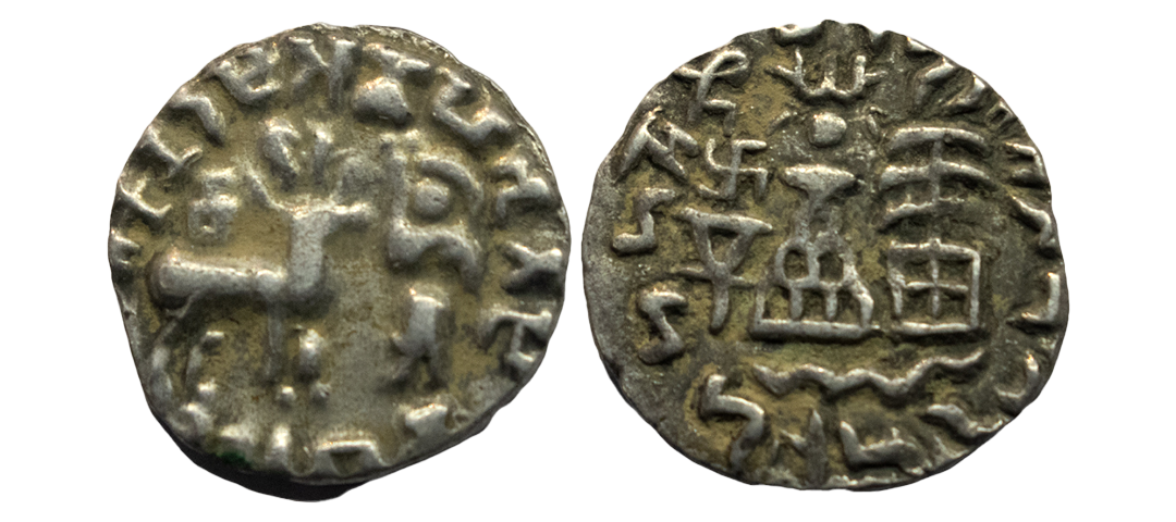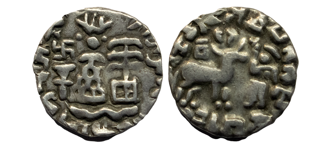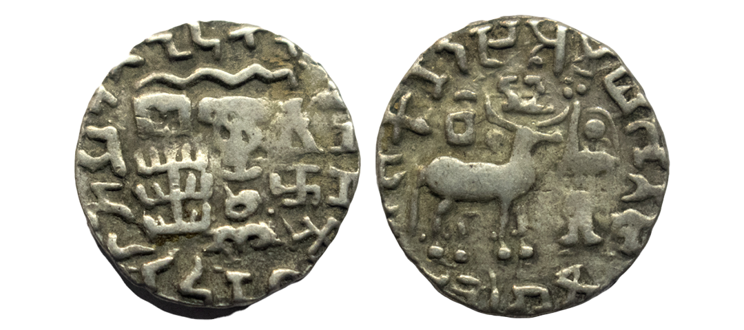 Ancient India, Post-Mauryan tribal monarchies, Kunindas, silver drachm of Amoghabhuti (c.50BC-50AD), PAIC 1198, 2.14g. Obv: goddess standing, holding lotus, a deer to her left, six-arched hill below the deers' belly, Shrivatsa.between horns and altar above rump; Brahmi legend Rajñah Kunindasa Amoghabhutisa Maharajasa around. Rev: composite symbol of six -arched hill, wavy line, Nandipada, Swastika, triangle-headed standard-Shrivatsa and tree-in-railing; Kharoshthi legend Raña Kunidasa …(bhutisa)… around. Extremely fine, Rare.