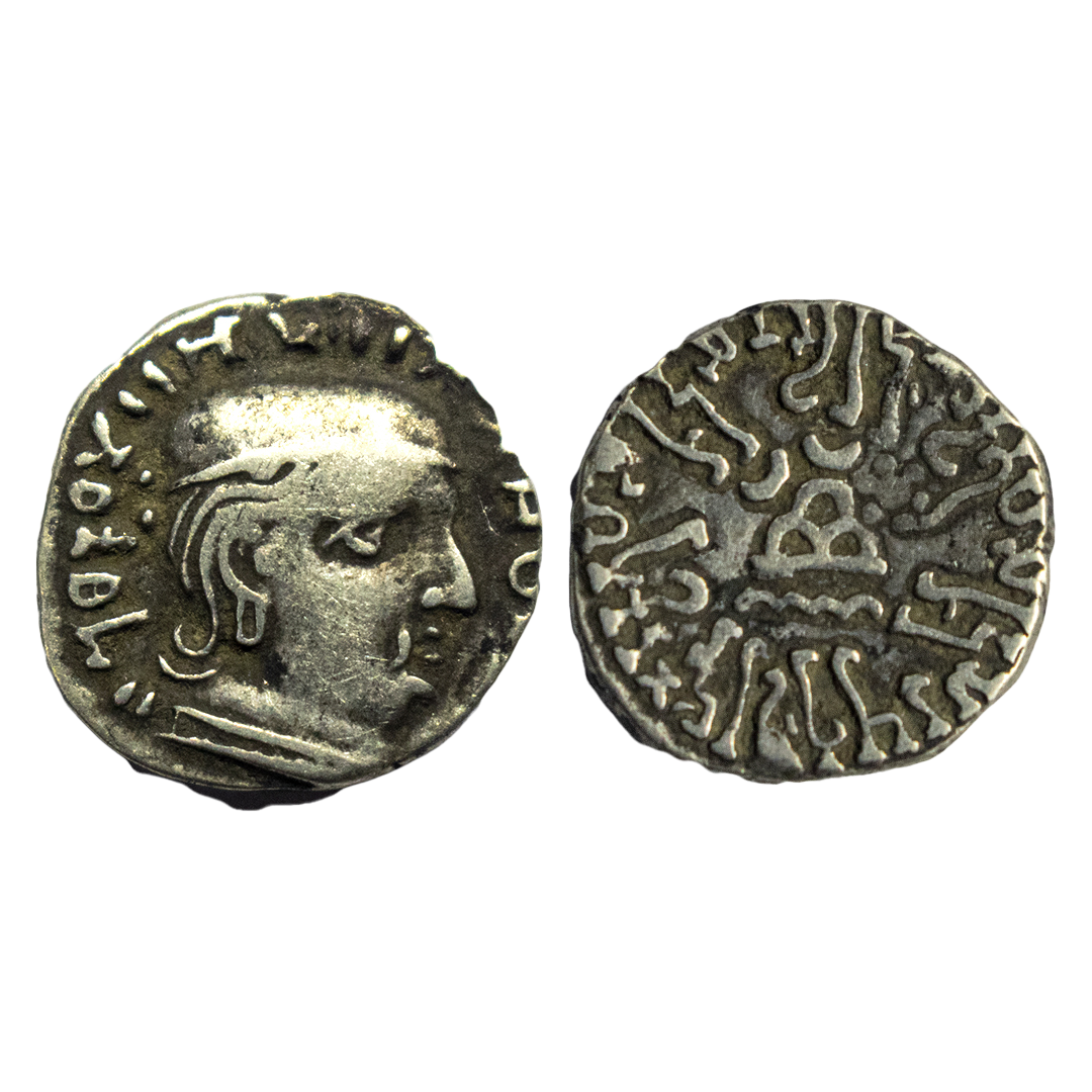 Unique coin of Rudrasena I, Hardly Few Specimen Known, In this legend the patronymic is shown as Rudrasihasaputrasa. No coin with this legend and this date was known for Rudrasena I as Kshatrapa until Fishman published an example, which he describes as unique. Western Kshatrapas, Kardamaka Dynasty, Rudrasena I (c. 198-222 AD), son of Rudrasimha I, SE 124, Silver Drachma, 2.38Grms, OBV: Bust of king facing to right side date digit behind in Brahmi and around corrupt Greek letters, REV: Three arched hill with crescent in centre, moon to left and sun to right, aroubd Brahmi legend’Rajno Mahakshatrapasa Rudrasihasaputrasa Rajno Mahakshatrapasa Rudrasenasa’. (Pieper # 3381). Very Fine+.