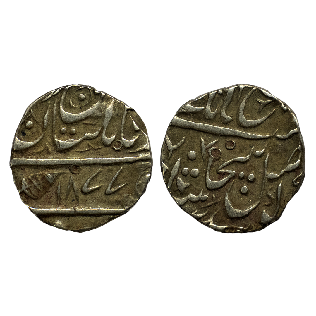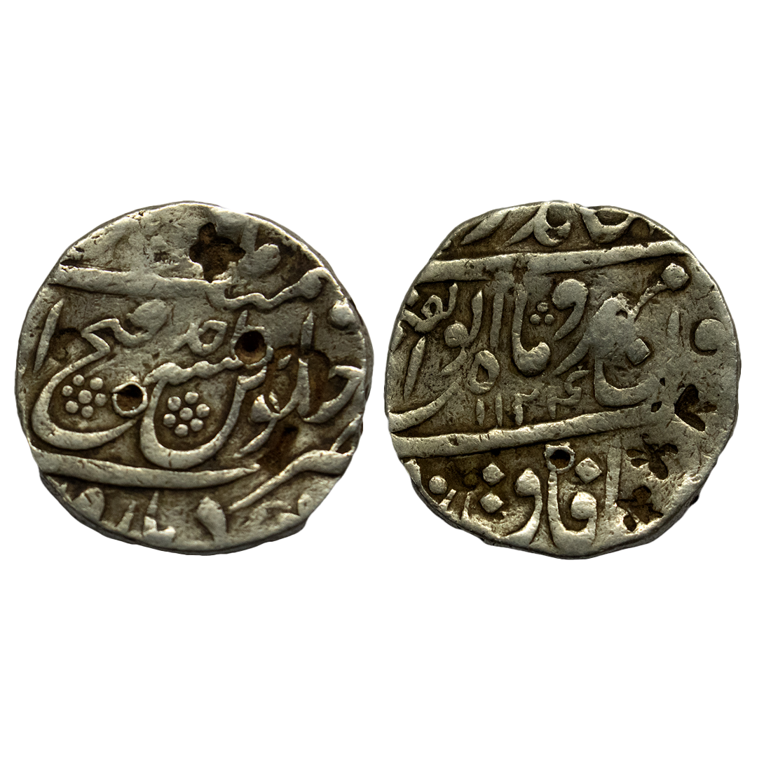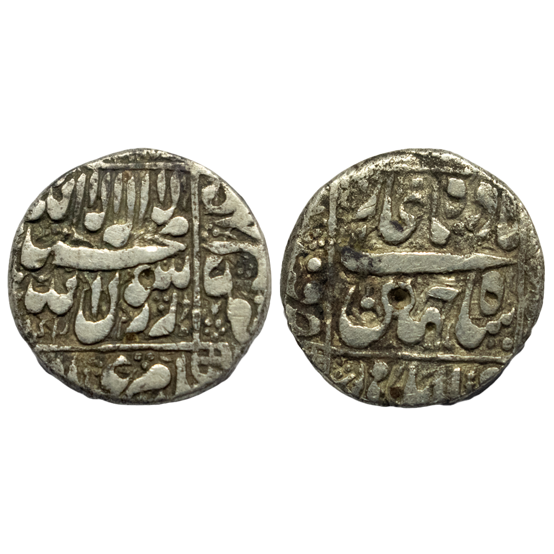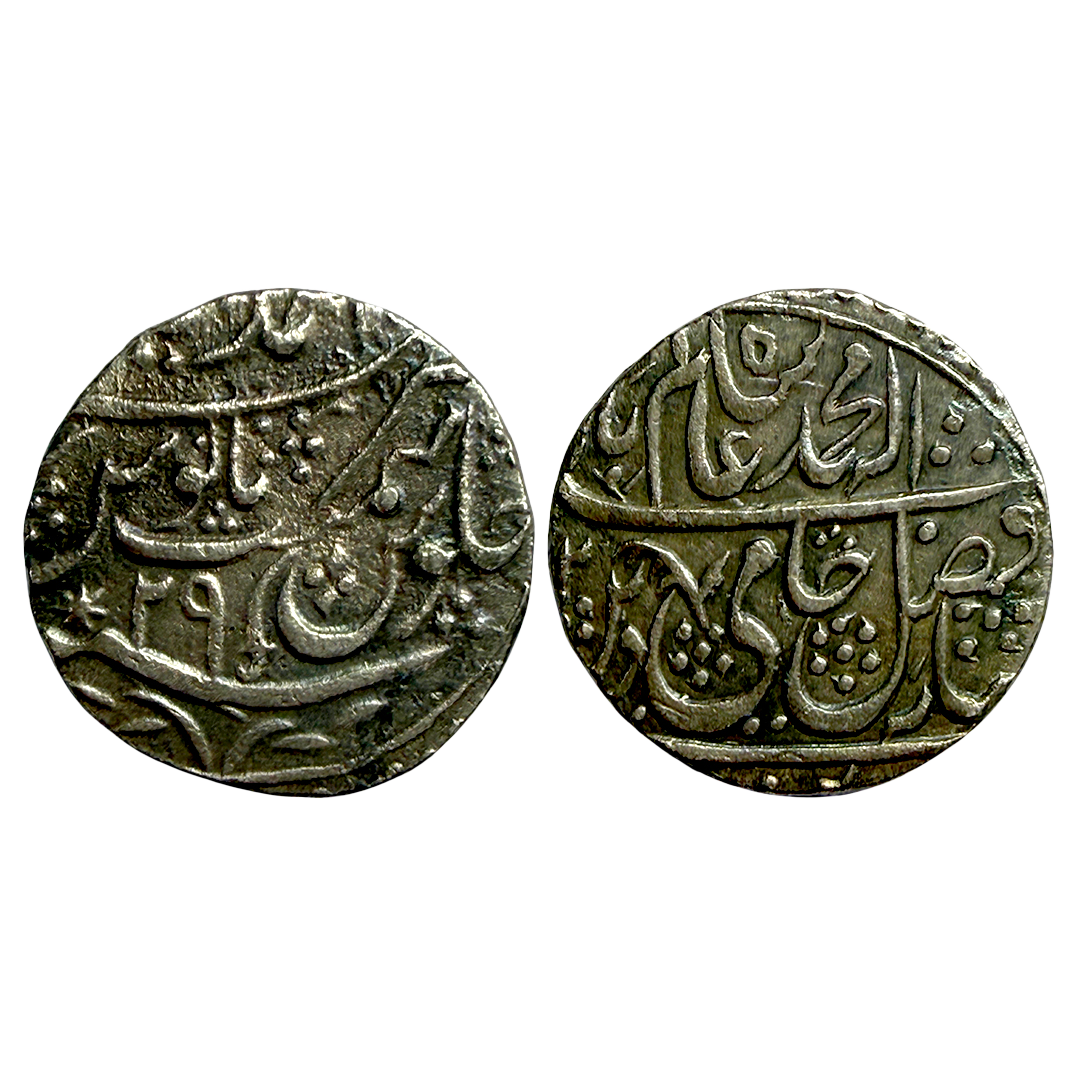 Mughal, Bedar Bakht, Ahmadabad Mint (Ghausgarh), Silver Rupee, 10.98 gms, AH 1202, RY 29, In the name of Shah Alam II, Obv: saya-e-fazle elah couplet, Rev: sana julus zarb, sword mark at bottom, KM # 738, about extremely fine, very rare.Issued by Bedar Bakht at the beginning of his rebellion before placing his own name on coinage, at Ghausgarh of Saharanpur which took the name Ahmadabad during the reign of Bedar Bakht (not the Ahmadeabad in Gujarat).