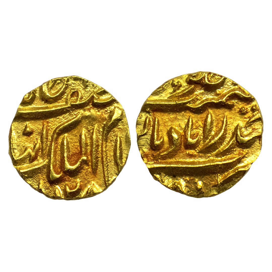 Hyderabad State, Afzal ud-Daula (AH 1273-1285/1857-1869 AD) ¼ Ashrafi, 2.75 gms, Farkhanda Bunyad Haidarabad Mint, AH 1278, Obv: Persian legend "sikka nizam-ul-mulk bahadur asif jah" with complete Hijri year 1279, Rev: Persian legend "sana julus" & "zarb Haidarabad" with the epithet "Farkhanda Bunyad", Variant of KM # Y 9, uncirculated, very rare