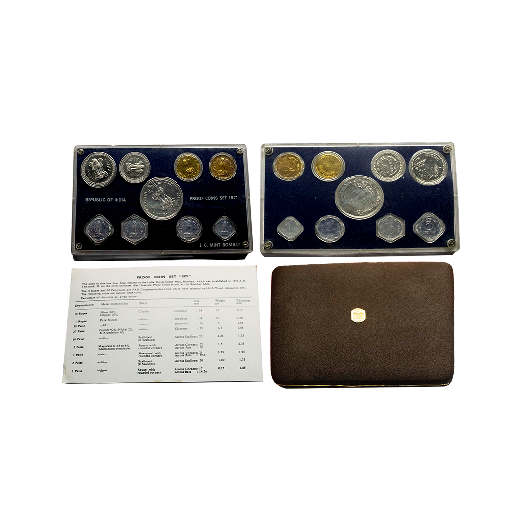 Republic India, 1971, Food for All, VIP Proof set of 9 coins, 10 Rupees, 1 Rupee, 50 Paise, 20 Paise, 10 Paise, 5 Paisa, 3 Paise, 2 Paise and 1 Paisa, Bombay Mint, (RB # 30), acrylic case pack in brown wooden box.