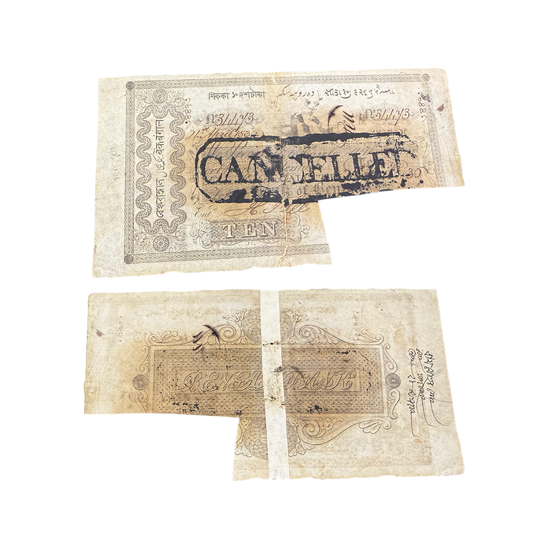 Bank of Bengal, 10 Sicca Rupees, Calcutta, hand signed, dated 21st April 1832, Serial No.: 3449. Obv: Bank of Bengal in ornamented panel on left in Bangla, Persian and Hindi, serial number on either side and denomination on lower left. Rev: BENGAL BANK Gothic and Printed by Perkins & Heath, London in top oval and type of Plate in lower oval within an ornamental panel, J&R 1A.3.3.1.Signature and three corner cut, Cancelled Stamped and Rejoined with paper tape on reverse, Very Fine, Rare.