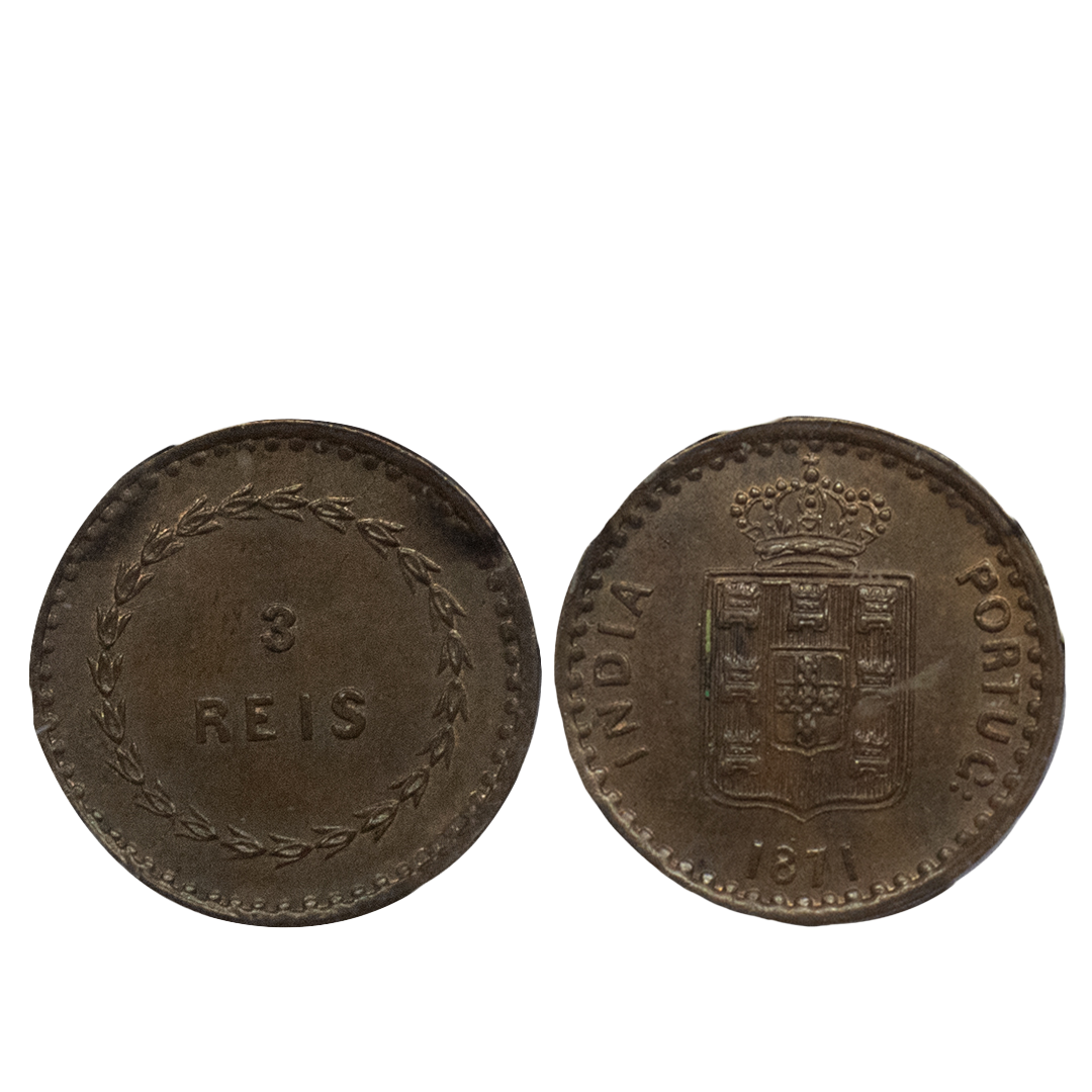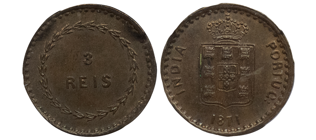 Indo-Portuguese, Colonical Coinage, Luiz I (Ludwig) (1861-1889 AD), Copper 3 Reis, 1871 AD, Obv: crown with shield, Rev: value, KM # 301, Graded by NGC as MS 63 BN, Mint State, rare.