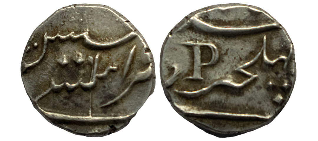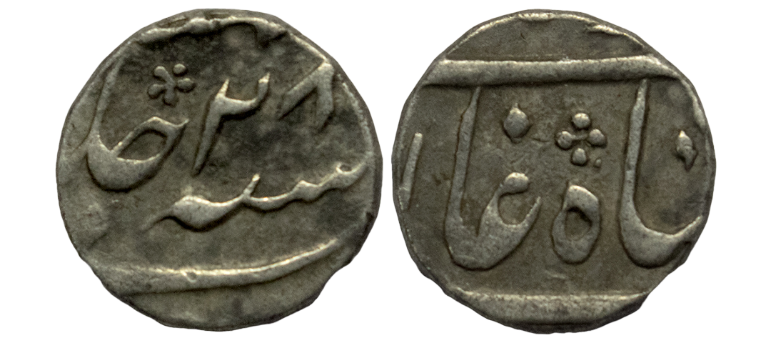 Nawab of Bengal, IItimad Ud-Daula Mir Qasim issue, Silver ⅛ Rupee (2 Anna), 1.41g, Munger Mint, RY 4, Uncirculated, Unique (only pc known), The Specimen offered here is listed in Zeno by Lingen, Paul Stevens has recognised and listed the coin under munger, CAT No. BE 160E. Historically important coin.The Nawab of Bengal, Itimad Ud-Daula Mir Qasim (1760-1763) shifted his capital from Murshidabad to Munger in June,1762 (1175 AH). After a year's reign he was removed as the Nawab by the East India Company in July 1763(1176 AH). During this period , Mir Qasim glorified the Munger city and established a mint there and issued coins. Interestingly this fraction is minted from a Nazrana die which is entirely different from conventional Munger rupees bearing the Sun symbol, Instead this has a five dot rosette symbol on the obverse side. As we get conventional Sun Siccas in the Hizri year 1177 AH from Munger mint, so it must be issued by the company. This new design was introduced by the Nawab probably to differentiate from normal sun siccas of other Bengal mints which were mainly controlled by the company to depreciate their values in ‘Battas’, which was one of the main reason behind the war between Nawab and company. Either this Nazrana die was not circulated due to the pressure of the company or withdrawn after the fall of Mir Qasim.