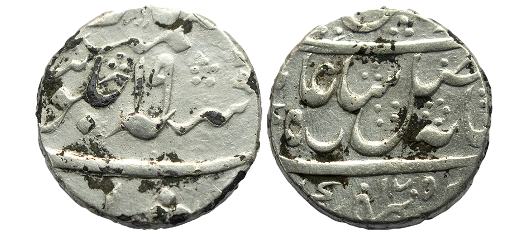 Nawab of Bengal, Murshidabad Mint, in the name of Ahmad shah Bahadur, Silver Rupee, 11.58g, AH (116)5/4, Maratha Mint mark in obverse, Extremely Fine, Extremely Rare.