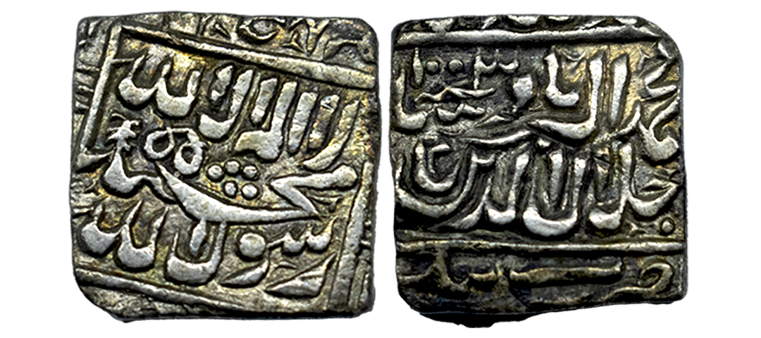 Akbar (AH 963-1014 / 1556-1605 AD), Silver Rupee, 11.36Grms, Dewal Bandar Mint, Ilahi type, Month Di, Year 4X, This mint is located in the province of Sind (near Karachi) and was an old river port. The mint of Dewal Bandar or Dewal as it was first read was published in a paper called "Some Novelties in Mughal Coins' published in the Numismatic Chronicle in 1896. (KM # 93.9).