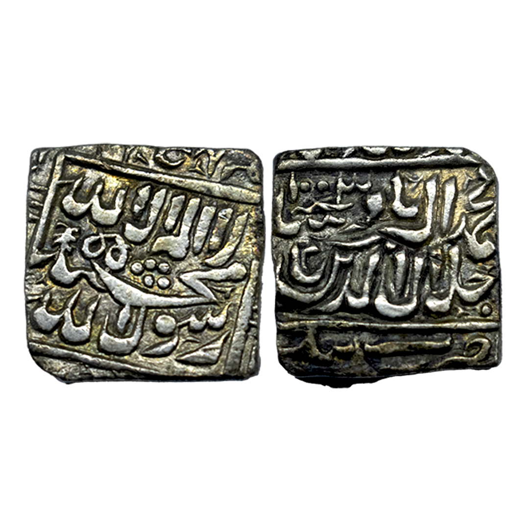 Akbar (AH 963-1014 / 1556-1605 AD), Silver Rupee, 11.36Grms, Dewal Bandar Mint, Ilahi type, Month Di, Year 4X, This mint is located in the province of Sind (near Karachi) and was an old river port. The mint of Dewal Bandar or Dewal as it was first read was published in a paper called "Some Novelties in Mughal Coins' published in the Numismatic Chronicle in 1896. (KM # 93.9).