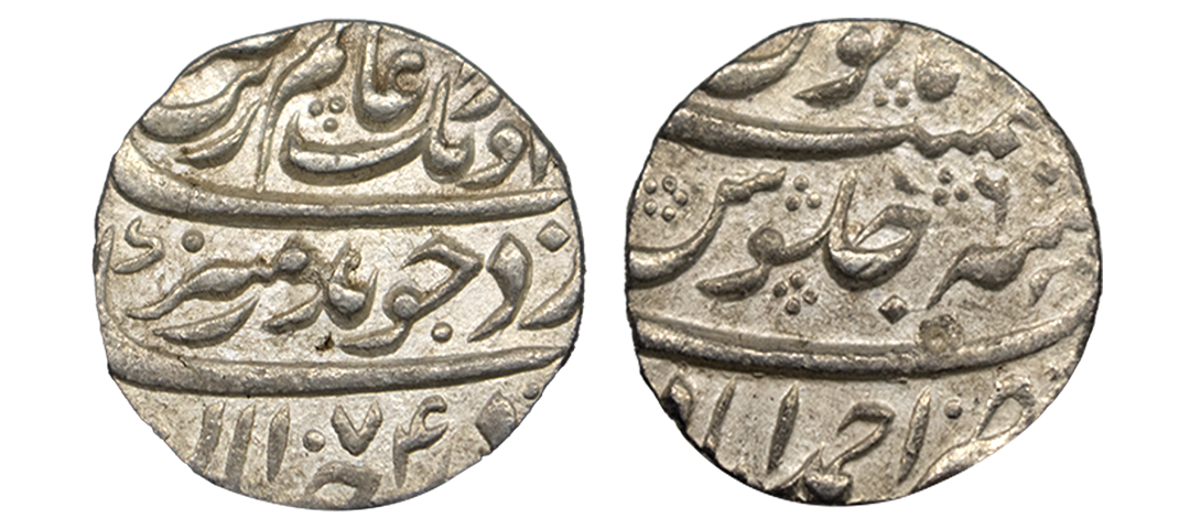 Aurangzeb (AH 1068-1118 / 1658-1707 AD), Silver Rupee, 11.38Grms, Khambayat Mint, AH 1109, RY 41, With Extra Word "Mim", Badr-e-munir type, complete mint name on rev bottom area. (KM # 300.51). Very Fine+.