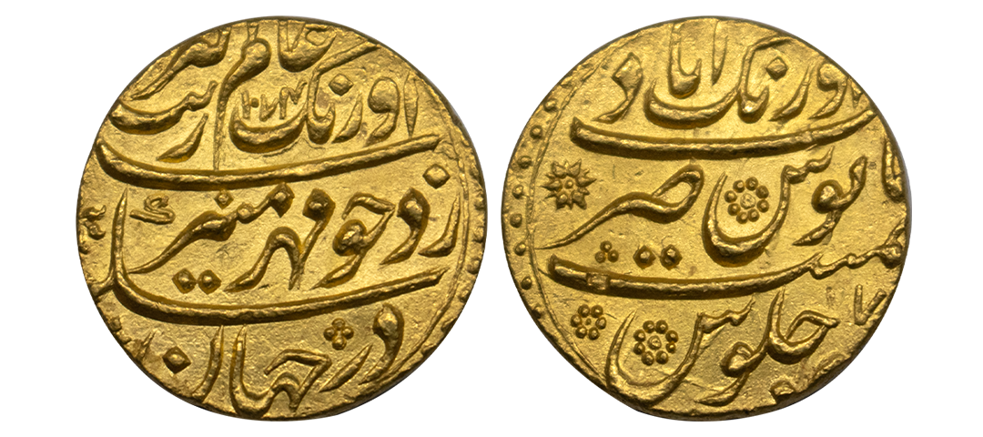 Aurangzeb (AH 1068-1118 / 1658-1707 AD), Gold Mohur, 10.98Grms, Aurangabad Mint, AH 1074, RY 7, complete mint name on rev top area. (KM # 315.10). Uncirculated.