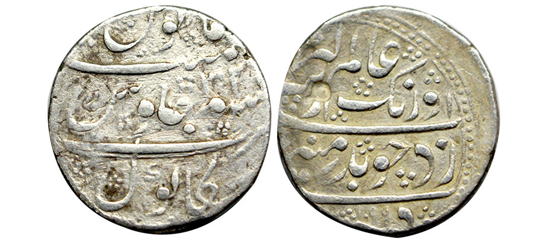 Aurangzeb (AH 1068-1118 / 1658-1707 AD), Silver Rupee, 11.38Grms, Khambayat Mint, AH 1109, RY 41, With Extra Word "Mim", Badr-e-munir type, complete mint name on rev bottom area. (KM # 300.51). Very Fine+.