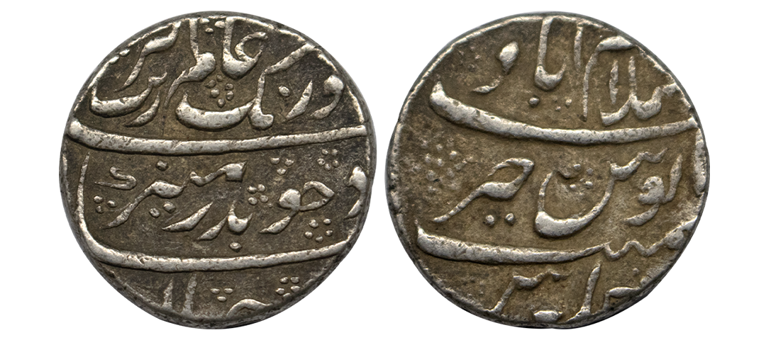 Aurangzeb (AH 1068-1118 / 1658-1707 AD), Silver Rupee, 11.38Grms, Khambayat Mint, AH 1109, RY 41, With Extra Word "Mim", Badr-e-munir type, complete mint name on rev bottom area. (KM # 300.51). Very Fine+.