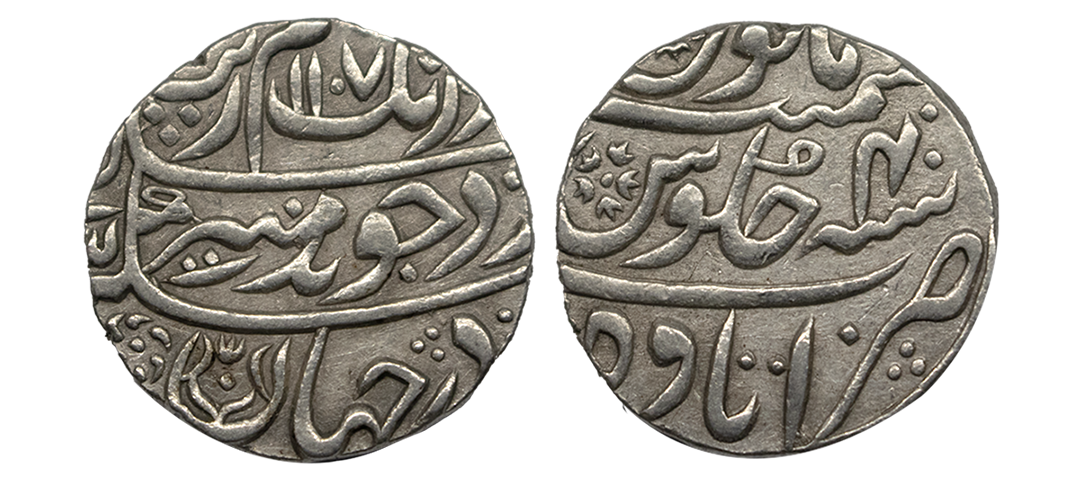 Murad Bakhsh (AH 1068 / 1658 AD), Silver Rupee, 11.48Grms, Khambayat ( very partly visible) Mint, Mint at Top, This is a rare issue with the word "Muhammad" omitted from the ruler's name and just written as "Murad Bakhsh" instead of the regular "Muhammad Murad Bakhsh" ,both sides central inscription within square knots at corners. (KM # 272.3). Very Fine+, Exceedingly Rare. Similar Specimen Sold in Marudhar Arts, Printed Auction #17 in the year 2016 for a hammer price of 80000 INR.