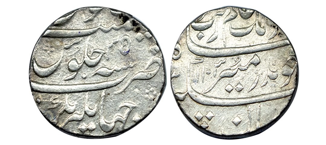 Aurangzeb (AH 1068-1118 / 1658-1707 AD), Silver Rupee, 11.38Grms, Khambayat Mint, AH 1109, RY 41, With Extra Word "Mim", Badr-e-munir type, complete mint name on rev bottom area. (KM # 300.51). Very Fine+.