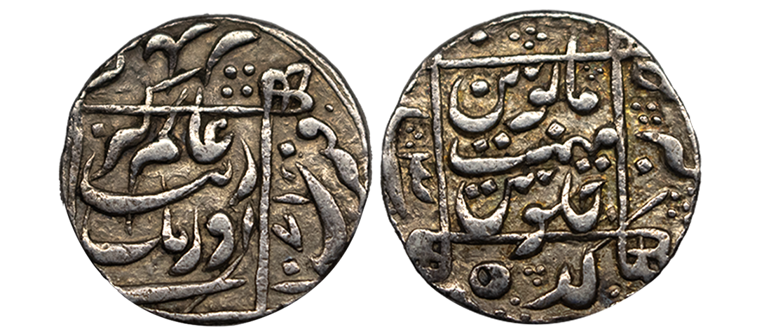Murad Bakhsh (AH 1068 / 1658 AD), Silver Rupee, 11.48Grms, Khambayat ( very partly visible) Mint, Mint at Top, This is a rare issue with the word "Muhammad" omitted from the ruler's name and just written as "Murad Bakhsh" instead of the regular "Muhammad Murad Bakhsh" ,both sides central inscription within square knots at corners. (KM # 272.3). Very Fine+, Exceedingly Rare. Similar Specimen Sold in Marudhar Arts, Printed Auction #17 in the year 2016 for a hammer price of 80000 INR.