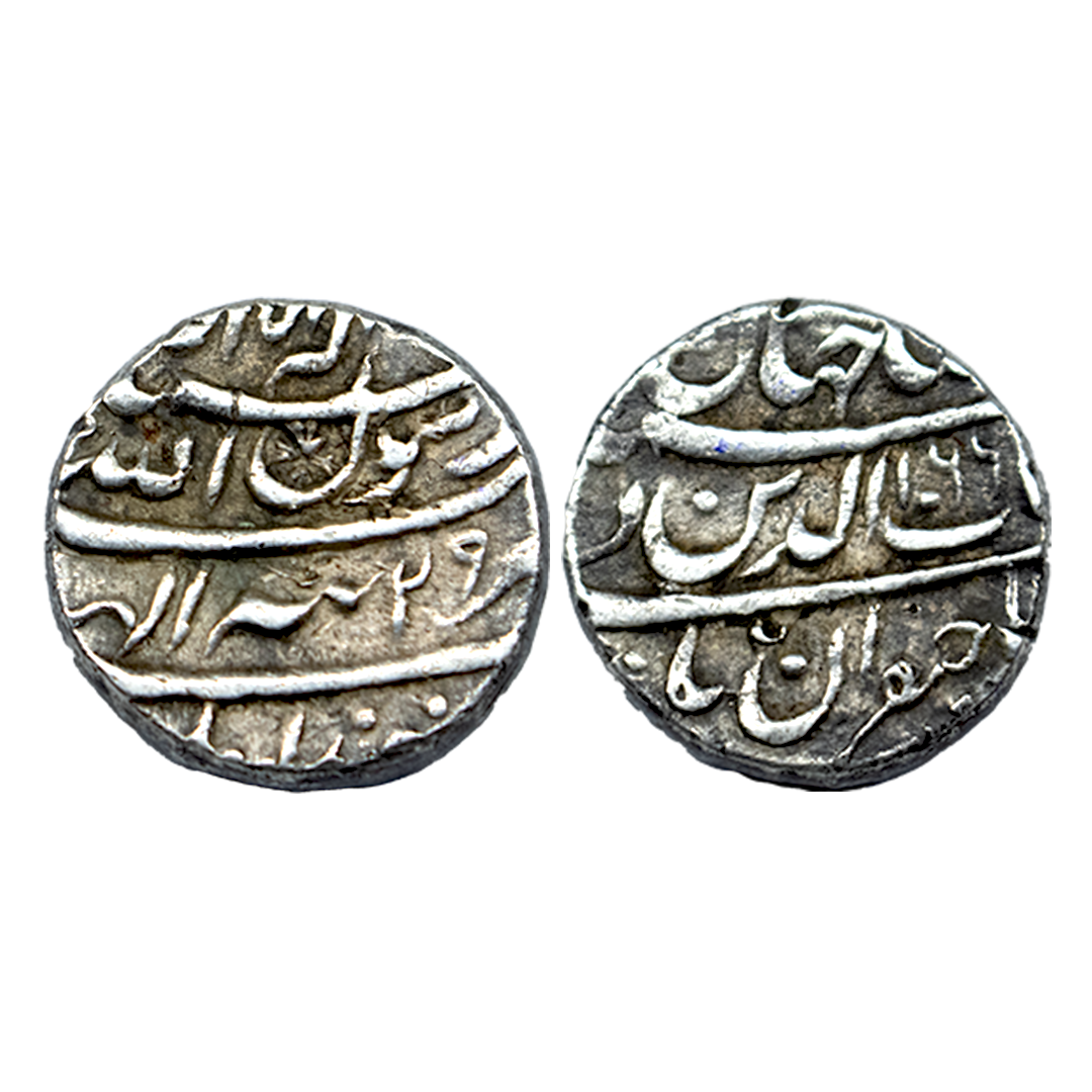 Aurangzeb (AH 1068-1118 / 1658-1707 AD), Silver Rupee, 11.38Grms, Khambayat Mint, AH 1109, RY 41, With Extra Word "Mim", Badr-e-munir type, complete mint name on rev bottom area. (KM # 300.51). Very Fine+.