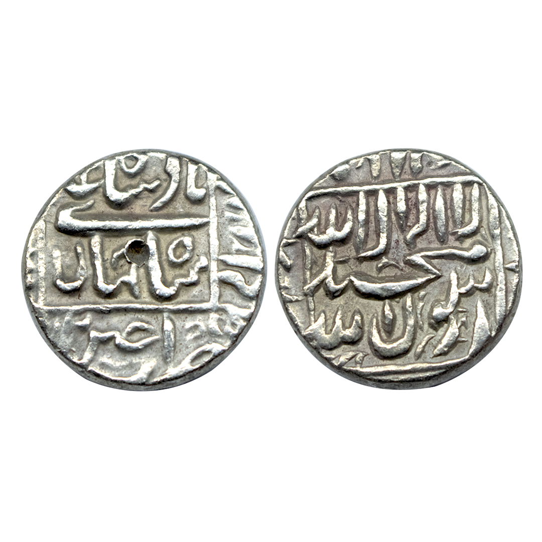 Murad Bakhsh (AH 1068 / 1658 AD), Silver Rupee, 11.48Grms, Khambayat ( very partly visible) Mint, Mint at Top, This is a rare issue with the word "Muhammad" omitted from the ruler's name and just written as "Murad Bakhsh" instead of the regular "Muhammad Murad Bakhsh" ,both sides central inscription within square knots at corners. (KM # 272.3). Very Fine+, Exceedingly Rare. Similar Specimen Sold in Marudhar Arts, Printed Auction #17 in the year 2016 for a hammer price of 80000 INR.