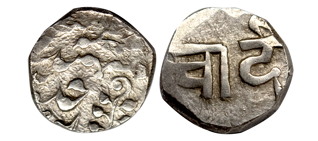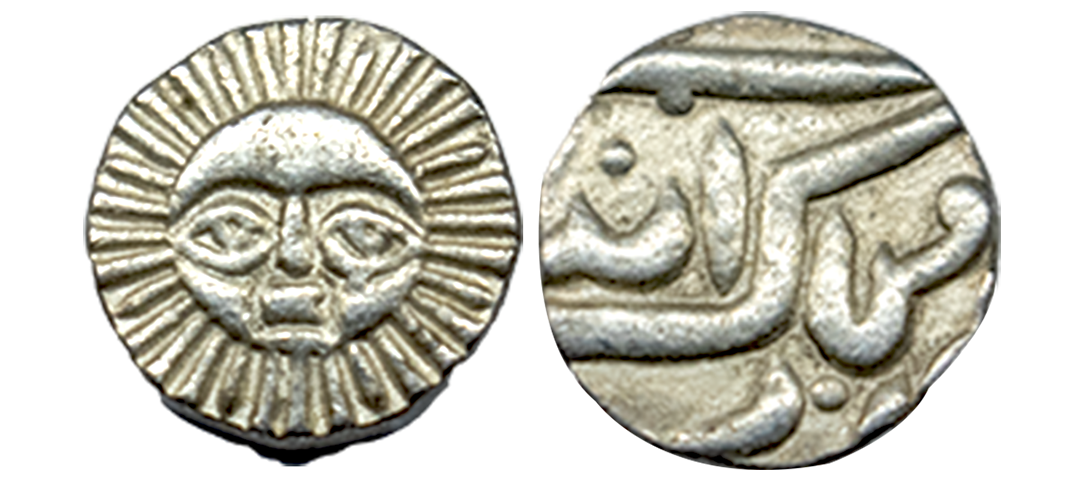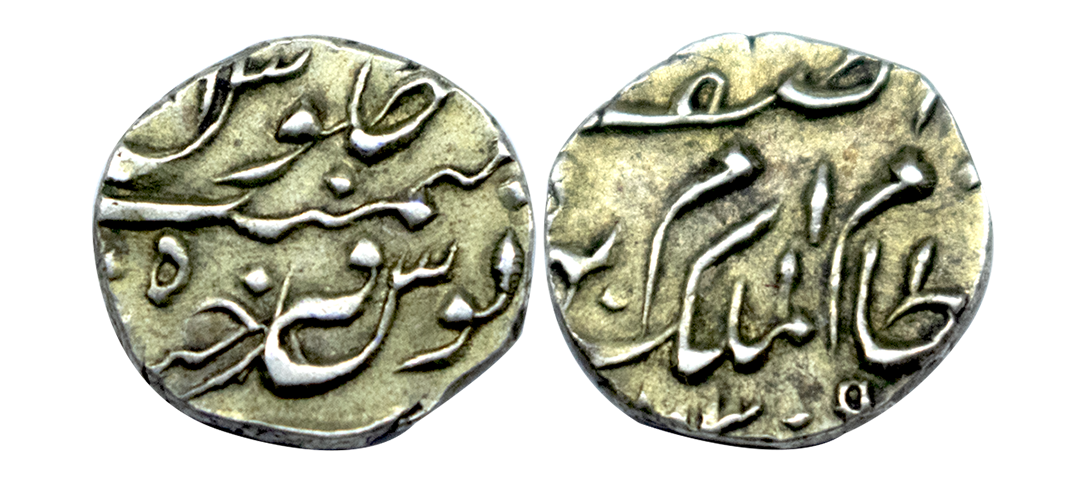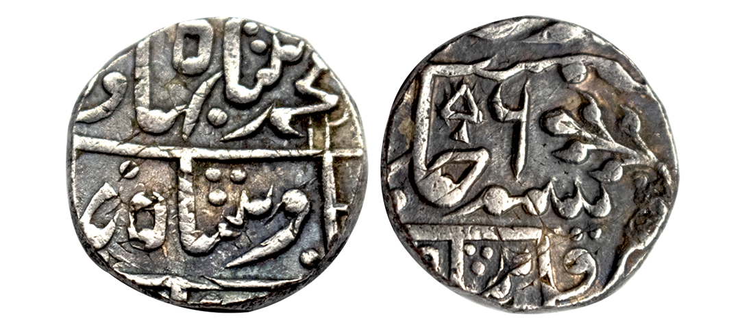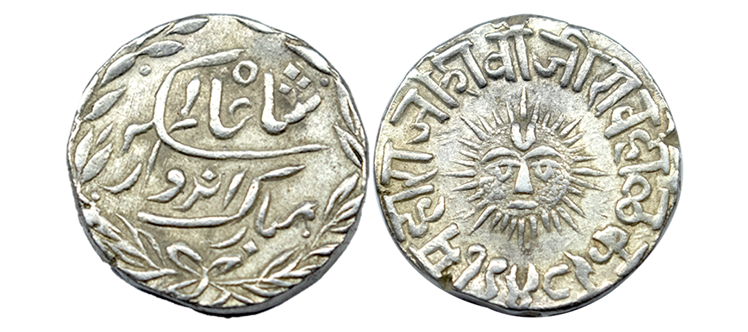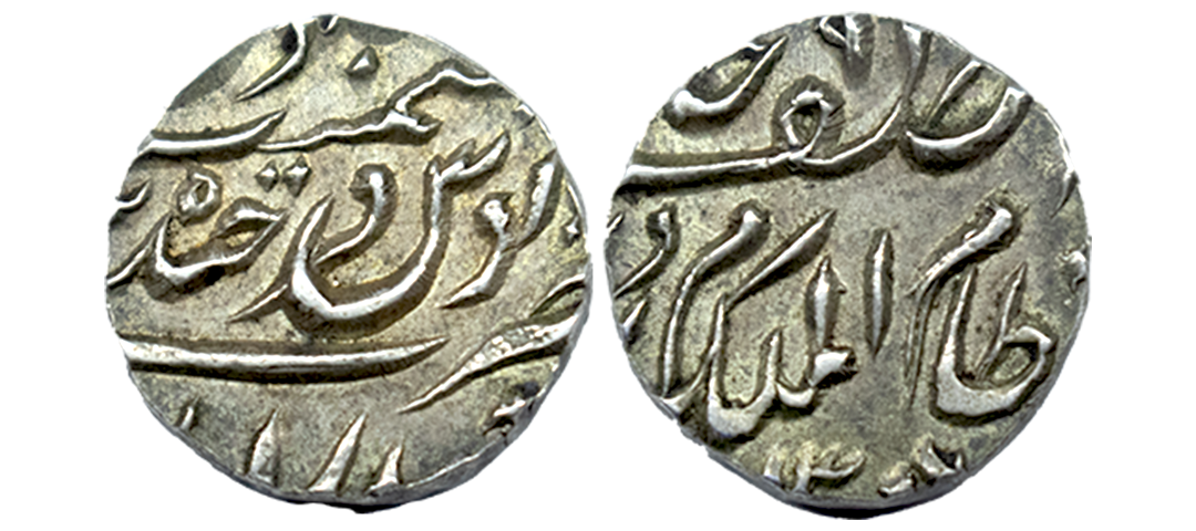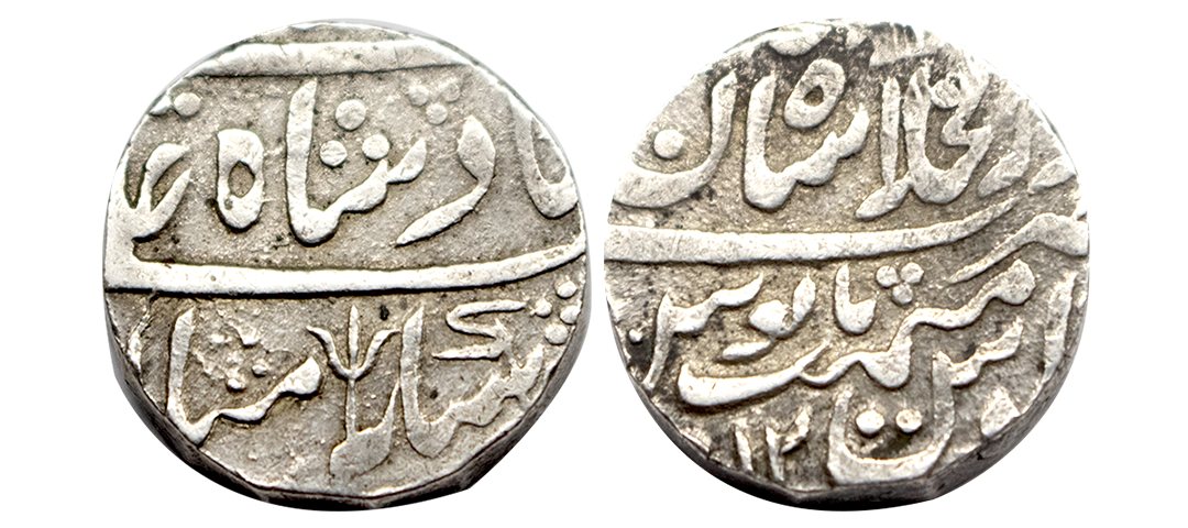 Gwalior, Daulat Rao Sindhia (1794-1827 AD), Silver Rupee, Isagarh Mint, in the name of Muhammad Akbar II, struck under the authority of Jean-Baptiste Filose; cannon and snake symbols on obverse and fly-whisk (chauri) and battleaxe symbols on reverse.Graded MS64 by NGC, Rare.