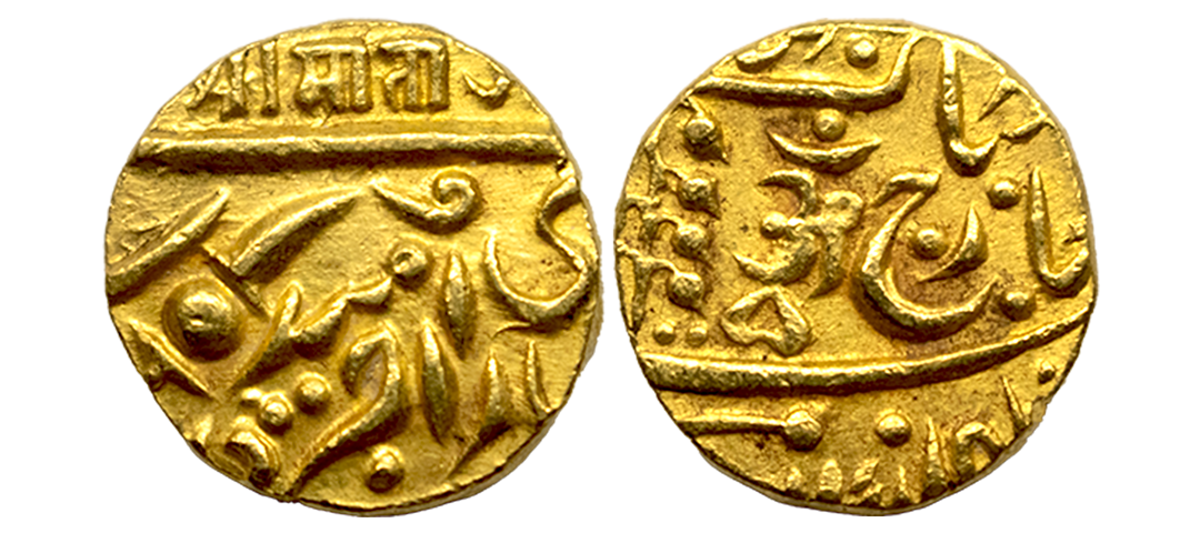 Jodhpur, Umaid Singh (c. 1918-1947 AD), Gold Mohur, "SRI MATA JI" 10.97Grms, in the name of George V British Emperor, ‘Mataji’ in Nagari with dagger on obv., Nagari letter ‘Om’ as a daroga mark on rev. (Lingen # J.15.01). Extremely Fine.
