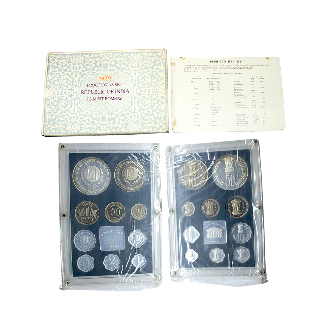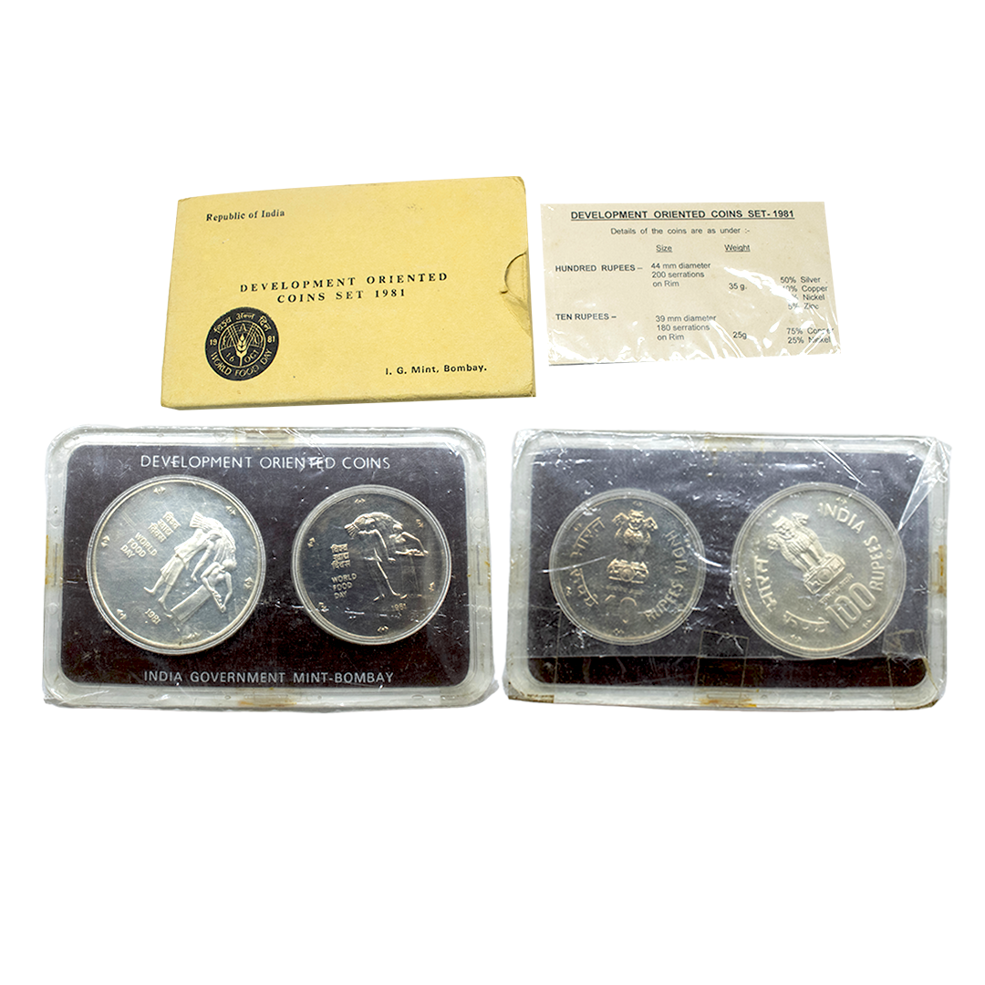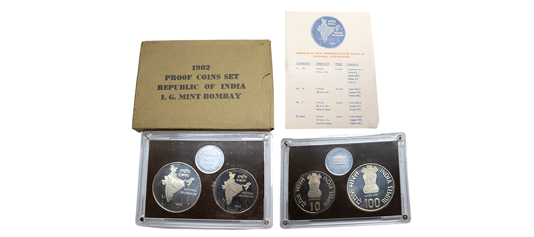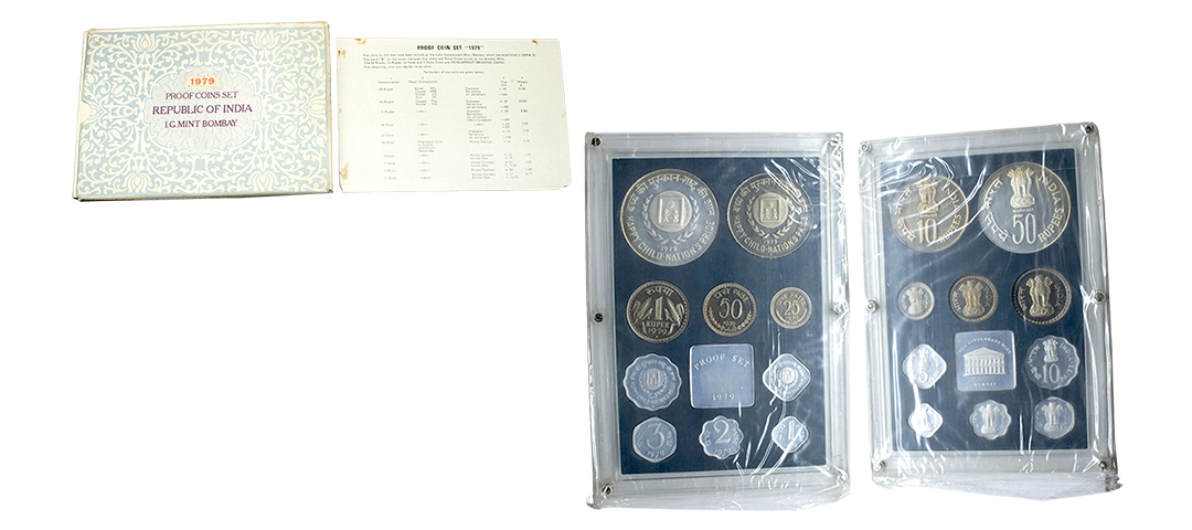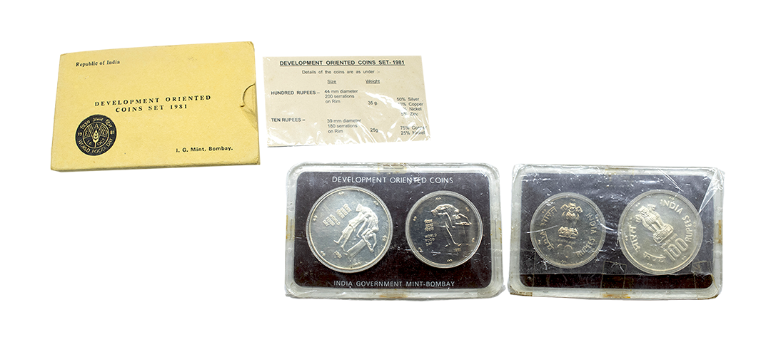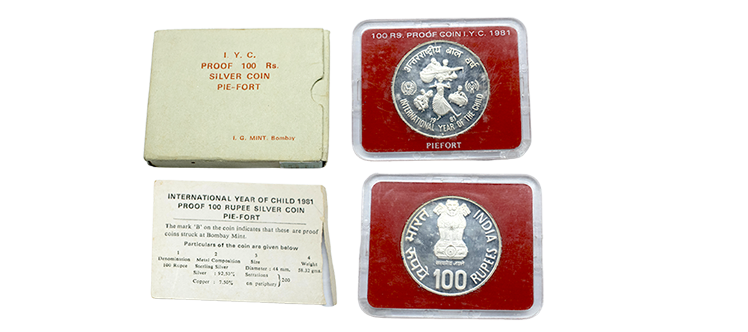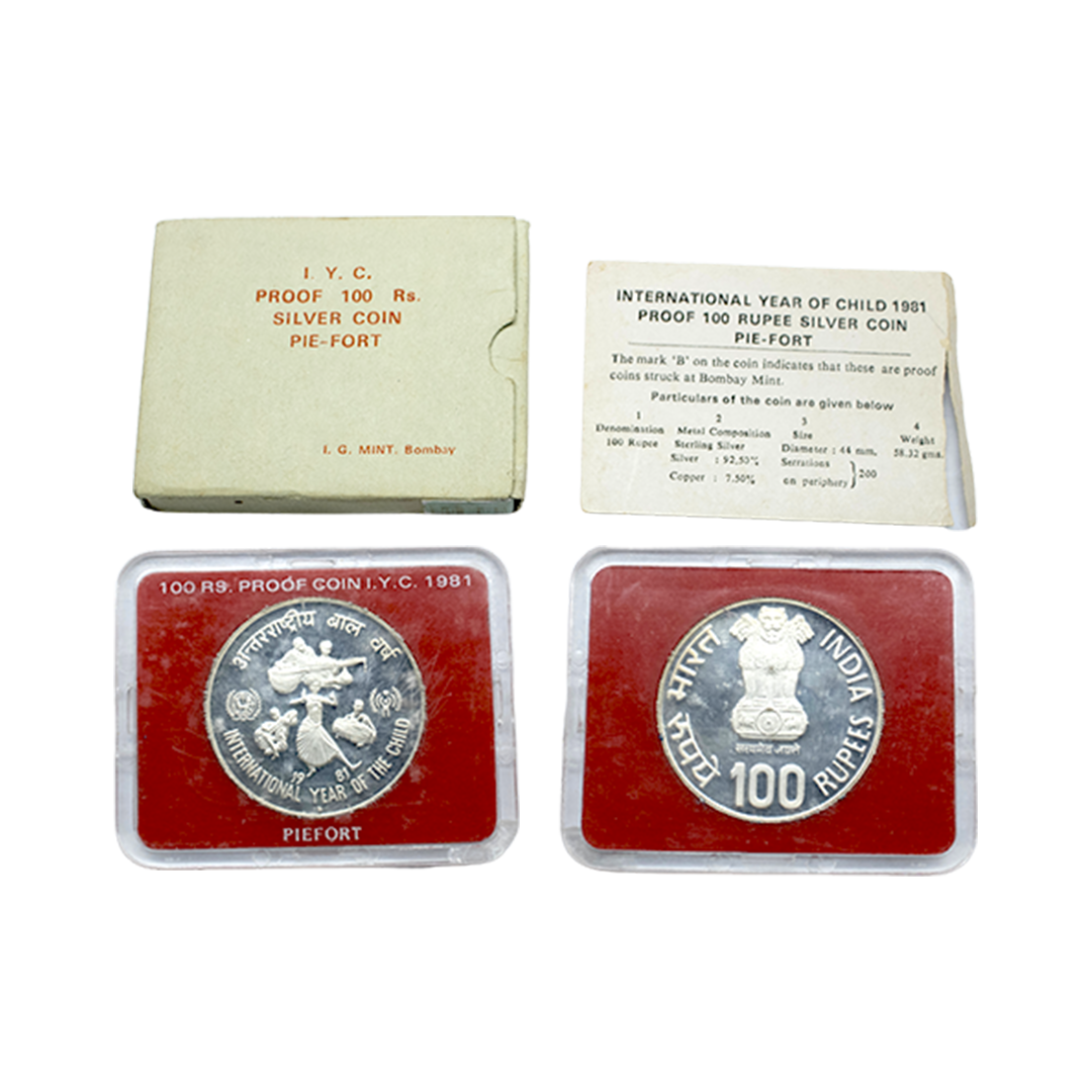 1981, Proof Set, PIE-FORT (Piedfort) Coin, International Year of the Child, Silver 100 Rupees, 58.32grams, Bombay Mint, (RB # 90), in immaculate condition with original packing in an acrylic case with outer cover and certificate, the coin is in mirror glaze cameo-like finish, proof, Extremely Rare. Note: "PIEFORT" or "PIEDFORT" are coins struck in a higher weight standard than the regular issue, on a thick planchet. This commemorative issue is the only type issued by the Indian Government Mint so far.