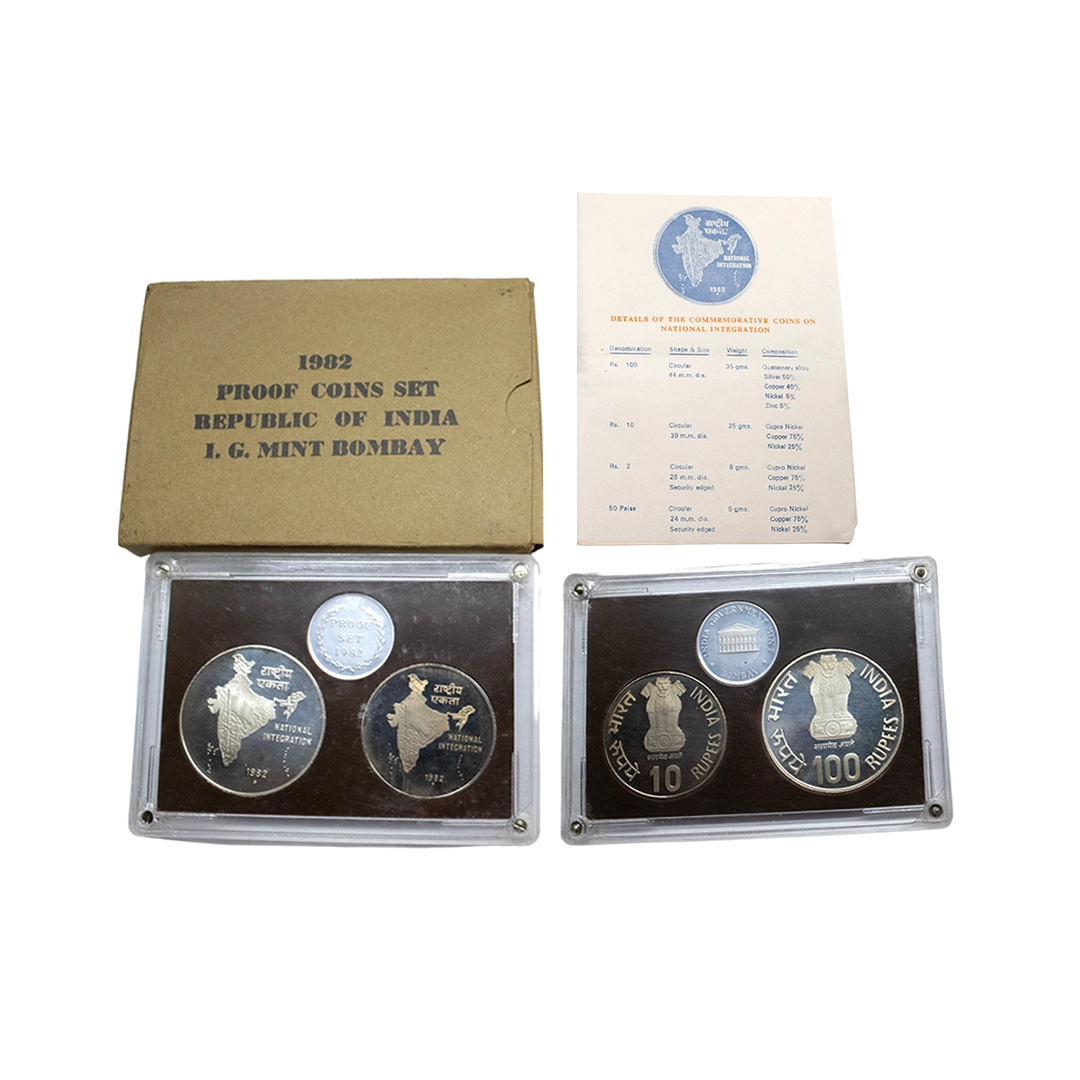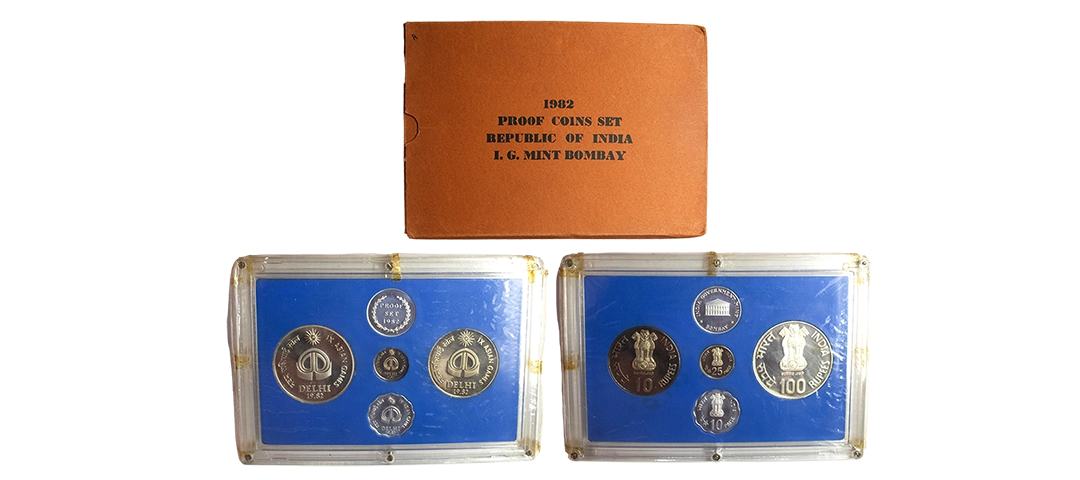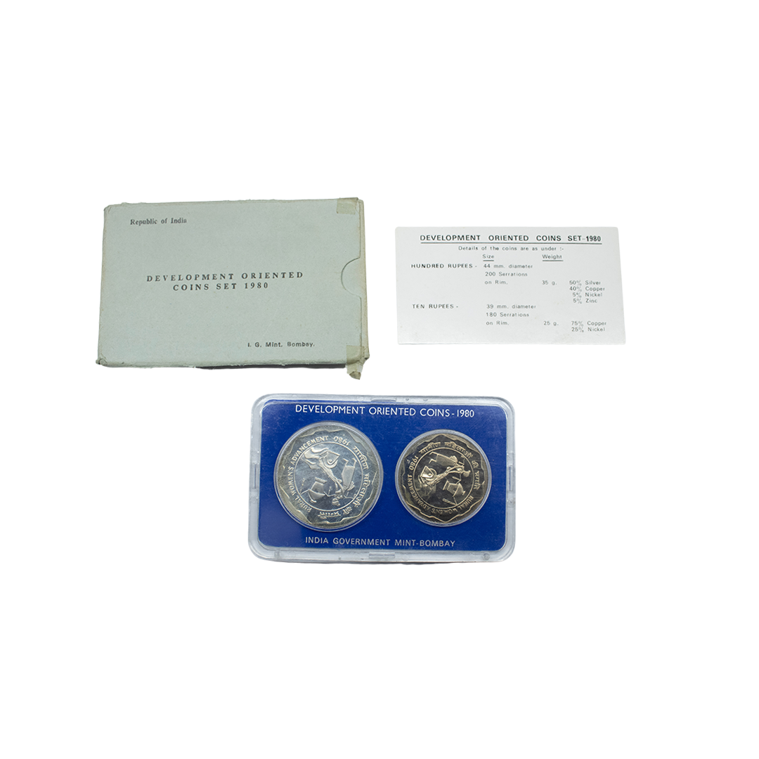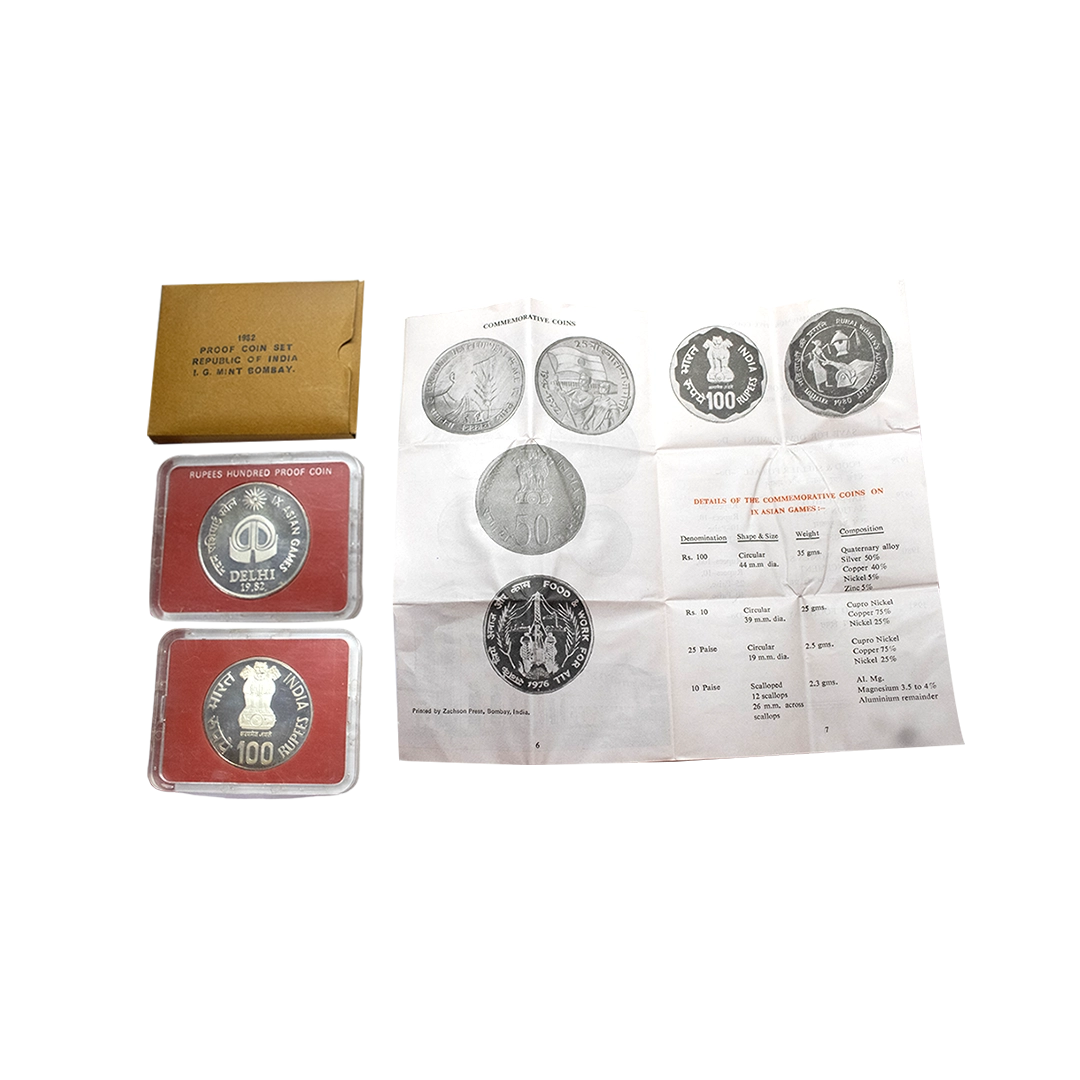 1981, Proof Set, PIE-FORT (Piedfort) Coin, International Year of the Child, Silver 100 Rupees, 58.32grams, Bombay Mint, (RB # 90), in immaculate condition with original packing in an acrylic case with outer cover and certificate, the coin is in mirror glaze cameo-like finish, proof, Extremely Rare. Note: "PIEFORT" or "PIEDFORT" are coins struck in a higher weight standard than the regular issue, on a thick planchet. This commemorative issue is the only type issued by the Indian Government Mint so far.