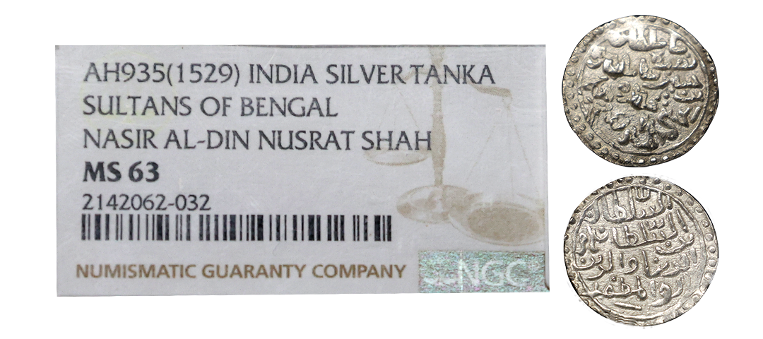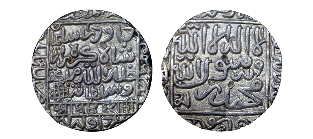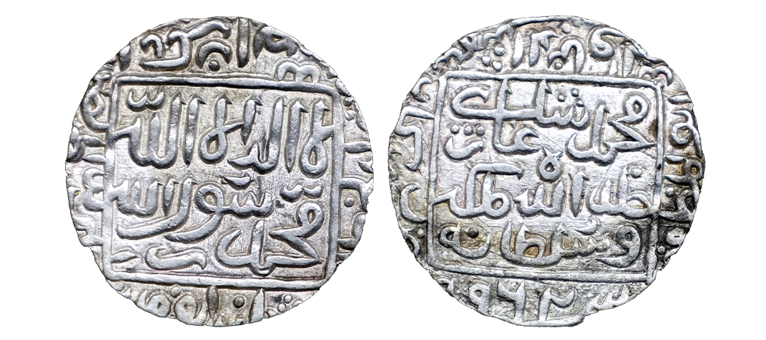 Sultans of Bengal, Shams al-Din Muhammad Ghazi (1552-1554/5 AD), Silver Rupee, Arakan Mint (completely visible), AH 962, G&G B960. Extremely Fine, No Test Masrks, Complete Mint & Date visible,Complete Flan in Pristine condition. The weaking of suri power during the latter part of the reign of Islam shah and upon the death of the Suri Ruler His Governor in Bengal assumed Independence with the title Shams al-din md shah Gazi and issued coin on the rupee standard, all coin bearing the mint name Arakan.