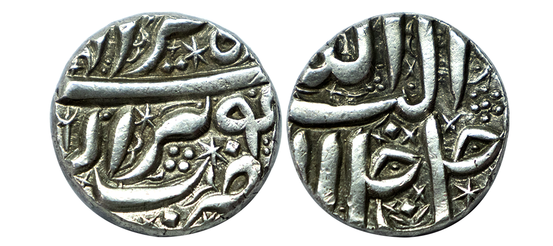 Akbar (AH 963-1014, 1556-1605 AD), Silver Rupee, 11.36 gms, Rebellion Issue of Jahangir, Jahangir as governor at Allahabad, Allahabad Mint, “Bagharb -O- Sharq” couplet, Obv: Hamesha hamchu z're Mihr wa Mah Rayijbad, Rev: bagharb-wa-Sharq jahan sikka Allahabad, KM # 97.1, extremely fine, very scarce.
