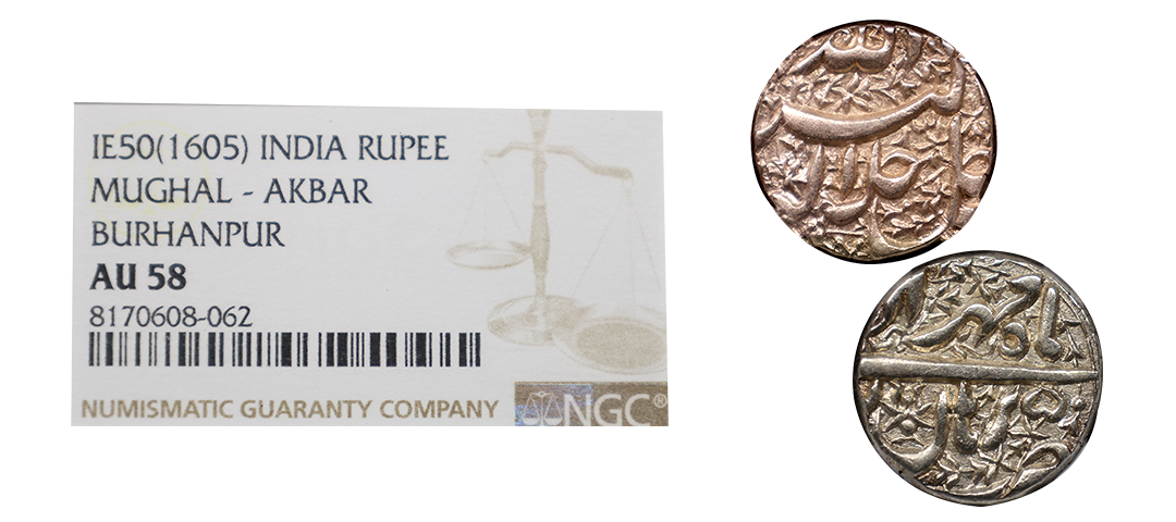 Akbar (AH 963-1014, 1556-1605 AD), Silver Rupee, 11.36 gms, Rebellion Issue of Jahangir, Jahangir as governor at Allahabad, Allahabad Mint, “Bagharb -O- Sharq” couplet, Obv: Hamesha hamchu z're Mihr wa Mah Rayijbad, Rev: bagharb-wa-Sharq jahan sikka Allahabad, KM # 97.1, extremely fine, very scarce.
