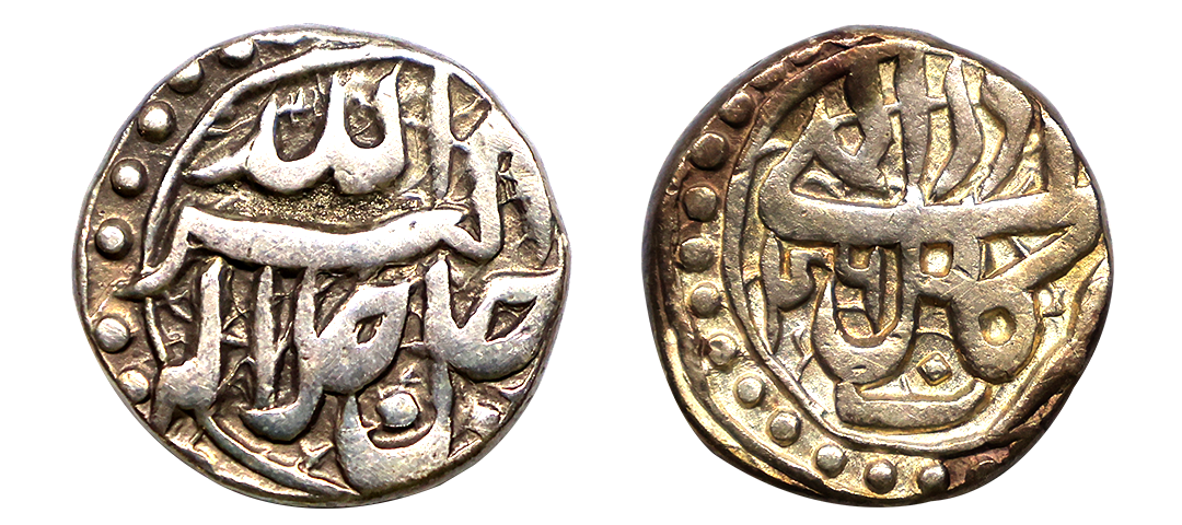 Akbar (AH 963-1014, 1556-1605 AD), Silver Rupee, 11.36 gms, Rebellion Issue of Jahangir, Jahangir as governor at Allahabad, Allahabad Mint, “Bagharb -O- Sharq” couplet, Obv: Hamesha hamchu z're Mihr wa Mah Rayijbad, Rev: bagharb-wa-Sharq jahan sikka Allahabad, KM # 97.1, extremely fine, very scarce.