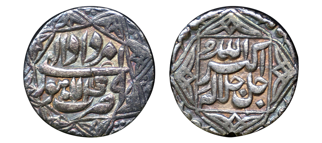 Akbar (AH 963-1014, 1556-1605 AD), Silver Rupee, 11.36 gms, Rebellion Issue of Jahangir, Jahangir as governor at Allahabad, Allahabad Mint, “Bagharb -O- Sharq” couplet, Obv: Hamesha hamchu z're Mihr wa Mah Rayijbad, Rev: bagharb-wa-Sharq jahan sikka Allahabad, KM # 97.1, extremely fine, very scarce.