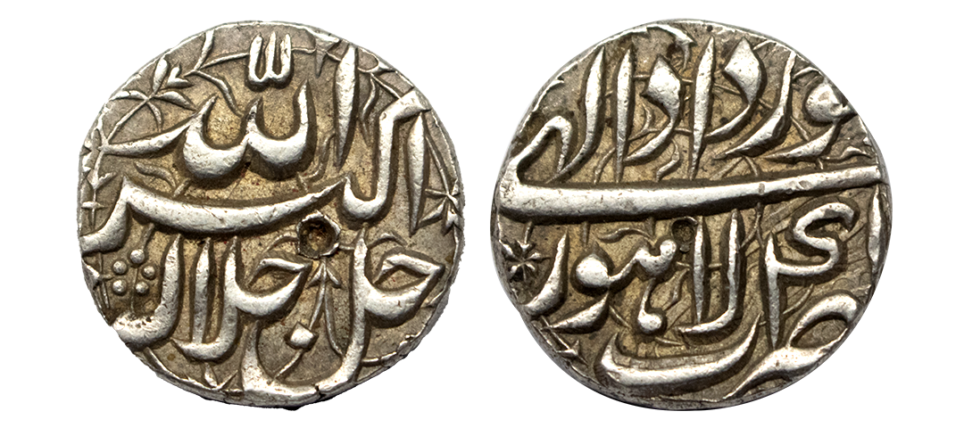 Akbar (AH 963-1014, 1556-1605 AD), Silver Rupee, 11.36 gms, Rebellion Issue of Jahangir, Jahangir as governor at Allahabad, Allahabad Mint, “Bagharb -O- Sharq” couplet, Obv: Hamesha hamchu z're Mihr wa Mah Rayijbad, Rev: bagharb-wa-Sharq jahan sikka Allahabad, KM # 97.1, extremely fine, very scarce.