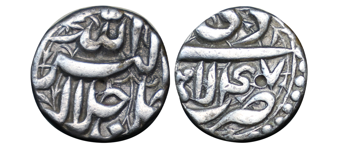Akbar (AH 963-1014, 1556-1605 AD), Silver Rupee, 11.36 gms, Rebellion Issue of Jahangir, Jahangir as governor at Allahabad, Allahabad Mint, “Bagharb -O- Sharq” couplet, Obv: Hamesha hamchu z're Mihr wa Mah Rayijbad, Rev: bagharb-wa-Sharq jahan sikka Allahabad, KM # 97.1, extremely fine, very scarce.