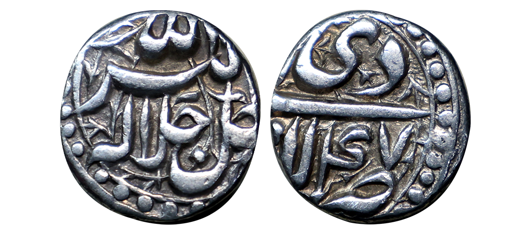Akbar (AH 963-1014, 1556-1605 AD), Silver Rupee, 11.36 gms, Rebellion Issue of Jahangir, Jahangir as governor at Allahabad, Allahabad Mint, “Bagharb -O- Sharq” couplet, Obv: Hamesha hamchu z're Mihr wa Mah Rayijbad, Rev: bagharb-wa-Sharq jahan sikka Allahabad, KM # 97.1, extremely fine, very scarce.
