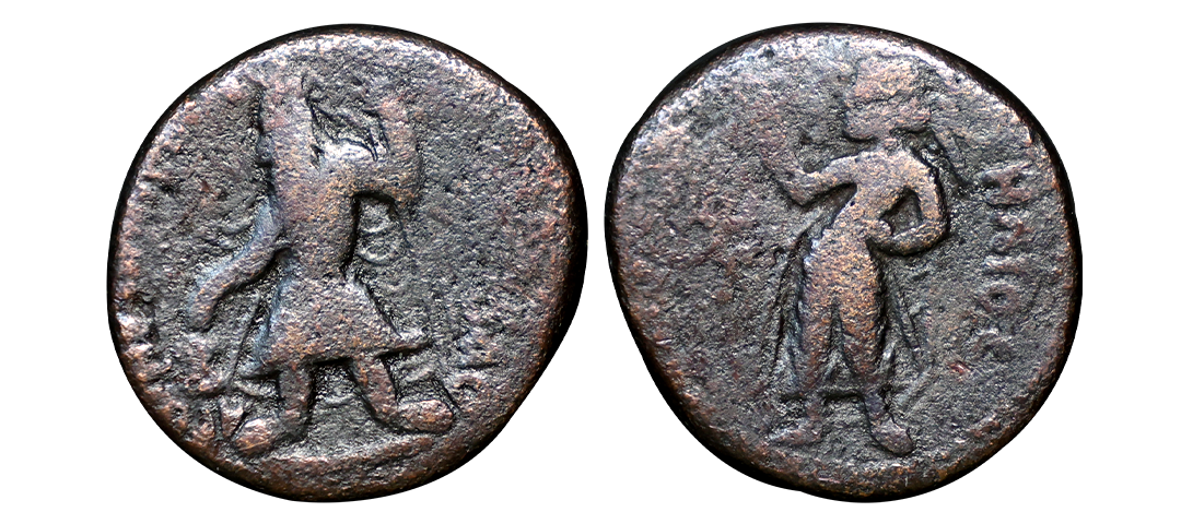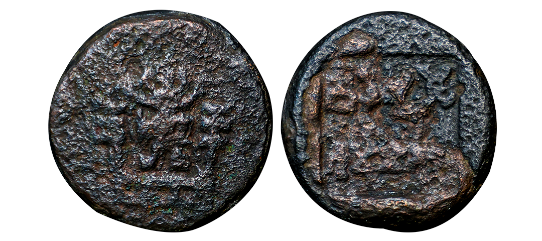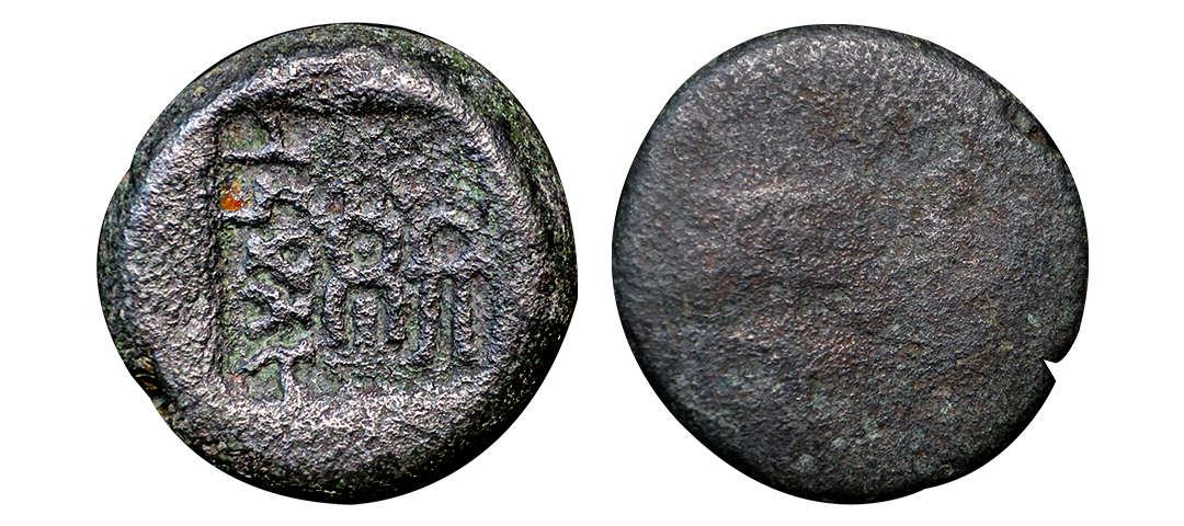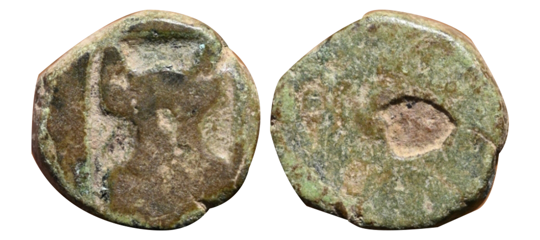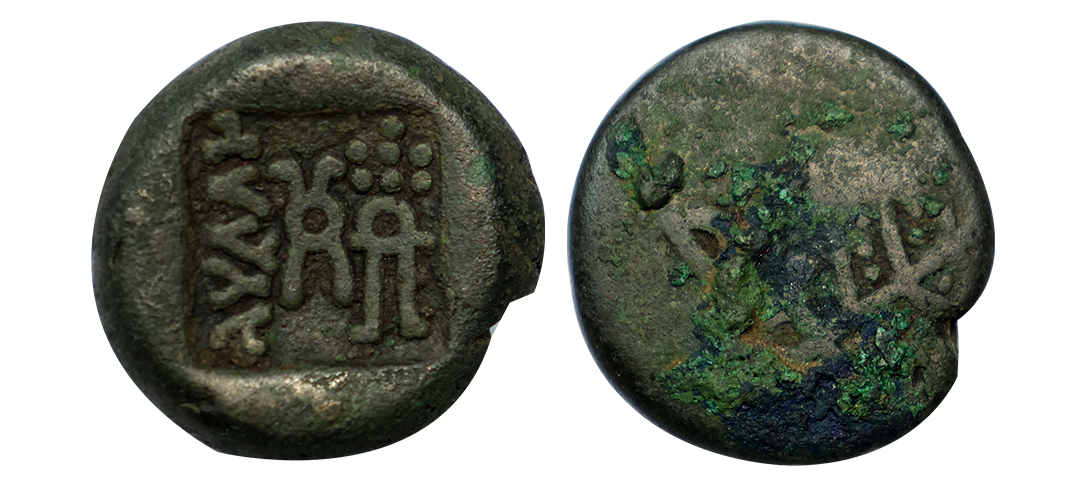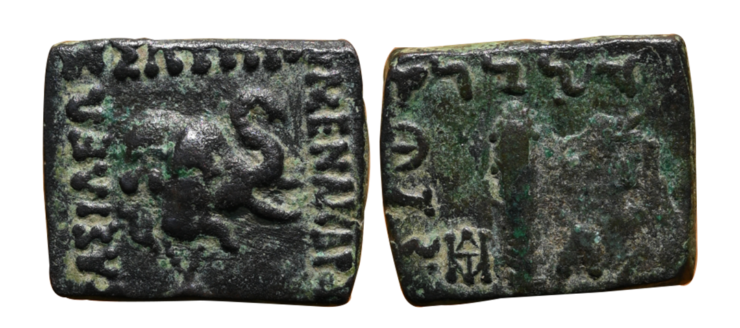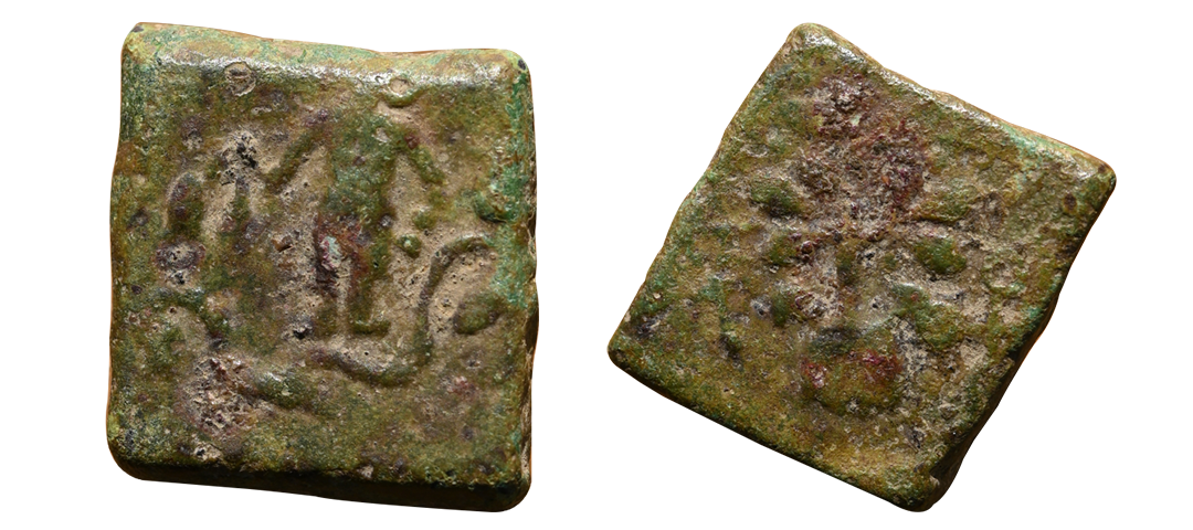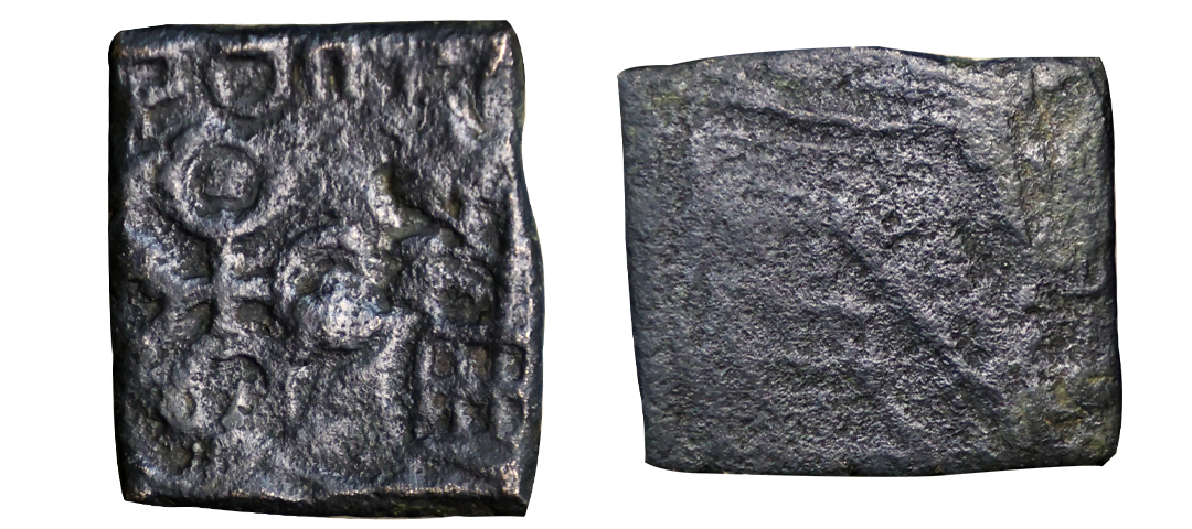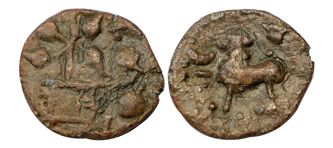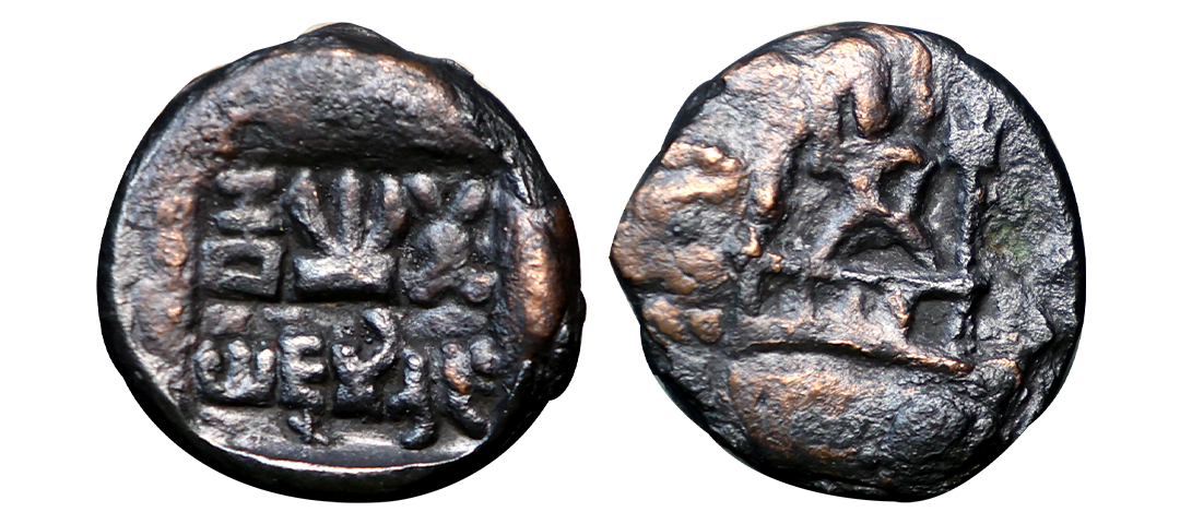 Ancient, Ujjain (2nd-1st Century BC), Copper Unit, 1.19 gms, Obverse: seated lion to right, Reverse: Ujjain symbol, Pieper #756, very fine, very scarce.