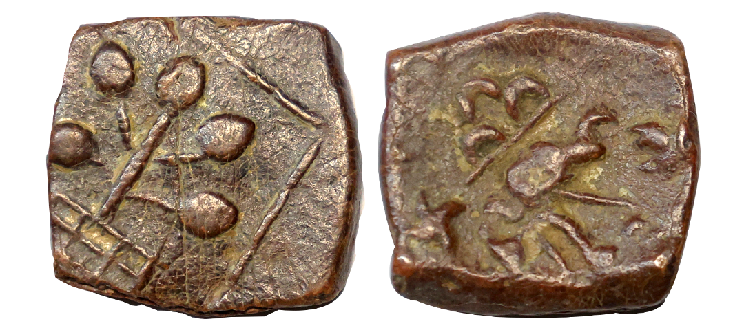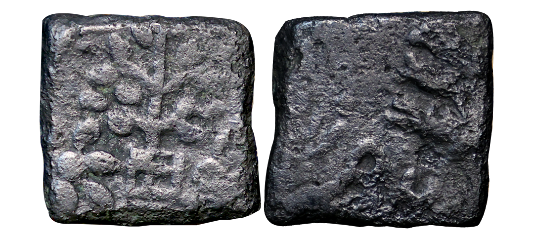 Ancient, Pre Satavahana, Vidarbha (2nd Century BC), Copper Unit, 6.62 gms, Obv. River deity holding two fish in hand & two snakes below, Rev. tree in railing, Pieper #2340, fine to very fine, very rare.