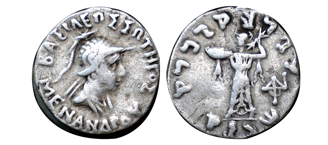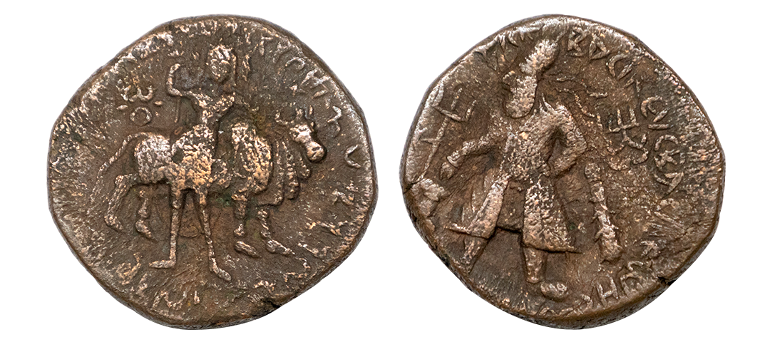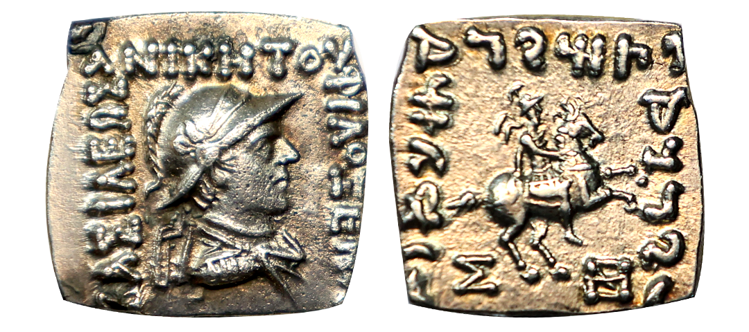 Indo-Greek, Philoxenos Aniketos (125-110 BC), Silver Square Drachm, 2.44 gms, Obv. Diademed, draped, and cuirassed bust right, wearing crested helmet adorned with bull's horn and ear & Greek legends 'BAΣIΛEΩΣ ANIKHTOY ΦIΛOΞENOY' around, Rev. Philoxenos in military attire right on rearing horse Σ to lower left, monogram to lower right & Kharosthi legends 'Maharajasa apadihatasa Philasinasa', around, Hoover #272, Bopearachchi 6D, extremely fine+, beautiful & bold strike with very high relief, very rare.