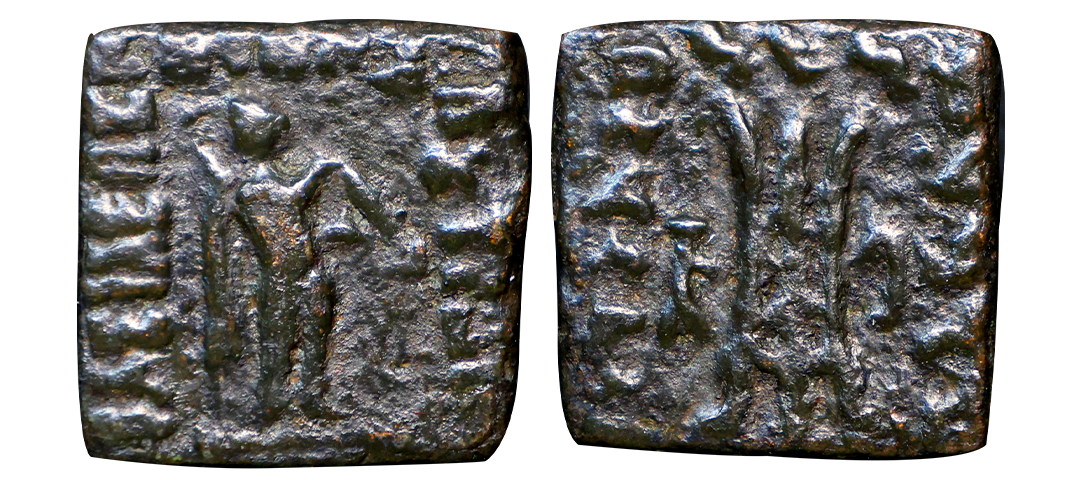 Panchala Dynasty, Yajnamitra (1st Centery CE), Copper Karshapana, 4.13 gms, Obv. rectangular incuse with three royal symbols of the panchala dynasty and the Brahmi legend below "YaJnaMiTaSa", Rev: a deity standing in archway on pedestal with trident and standard besides, Unlisted, very fine+, extremely rare.