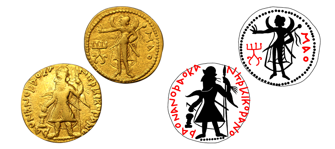 Kushans, Kanishka I (127-152 AD), 'Mao' Type, Gold Dinara, 7.85gms, Obv. Standing King holding a spear in his left hand and with right hand sacrificing at a fire altar, Bactrian legend around reading ‘þAONANOþAO KA - NηþKIKOþANO’, Rev. Mao (Mithra) standing to left, extending hand in benediction and holding scepter, tamgha at left, Bactrian legend at right ‘MAO’, Dotted border, ANS Kushan 379, very fine+, very rare.