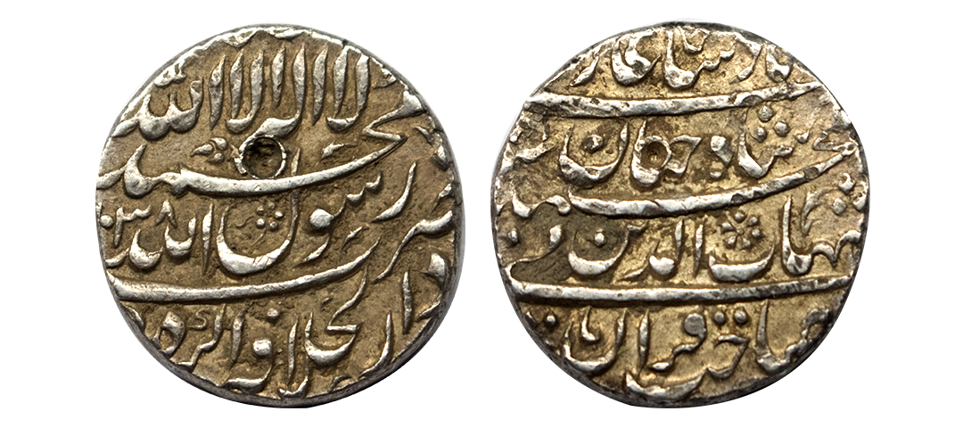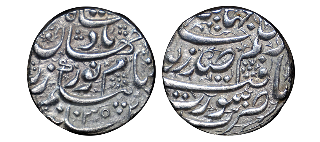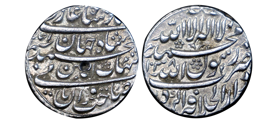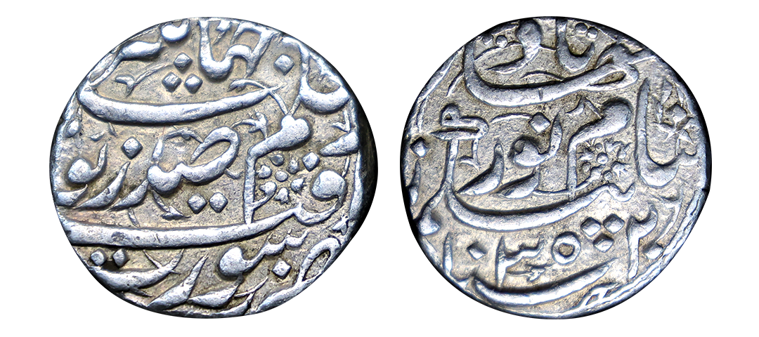 Nur Jahan (AH 1033-1037, 1623-1627 AD), Silver Rupee, 11.38 gms, Surat Mint, AH 1035, RY 20, ‘Zad Zewar’ Couplet, Obv. ze hukum jahangir yaft zad zewar zarb surat, Rev. banam nurjahan badshah begum zar hijri 1035, KM # 168.6, Bold Strike, Almost Uncirculated, very rare.