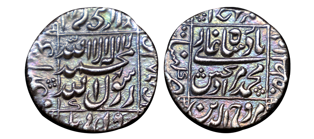 Shah Jahan (AH 1037-1068, 1628-1658 AD), Silver Rupee, 11.50 gms, Ujjain Mint (on Top), RY 25, Obv. Kalima Shahada within a square frame four Caliphs' names at the margins, Rev. Shah jahan Badshah ghazi in centre & Saheb-e-qiran 25 Sani Shihab-ud din Muhammad zarb Ujjain in margins, Unlisted Type, very fine+, rare.