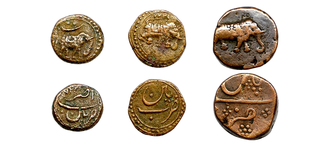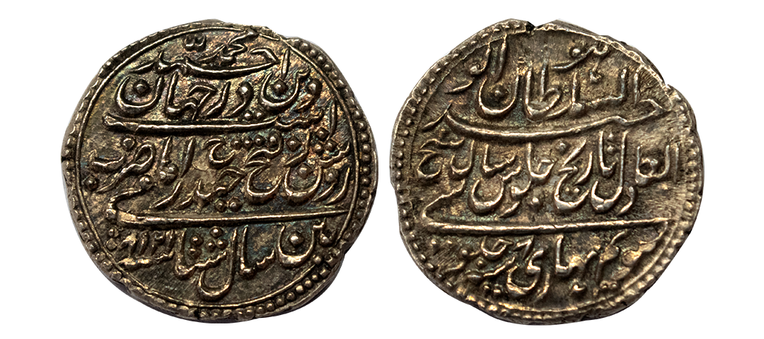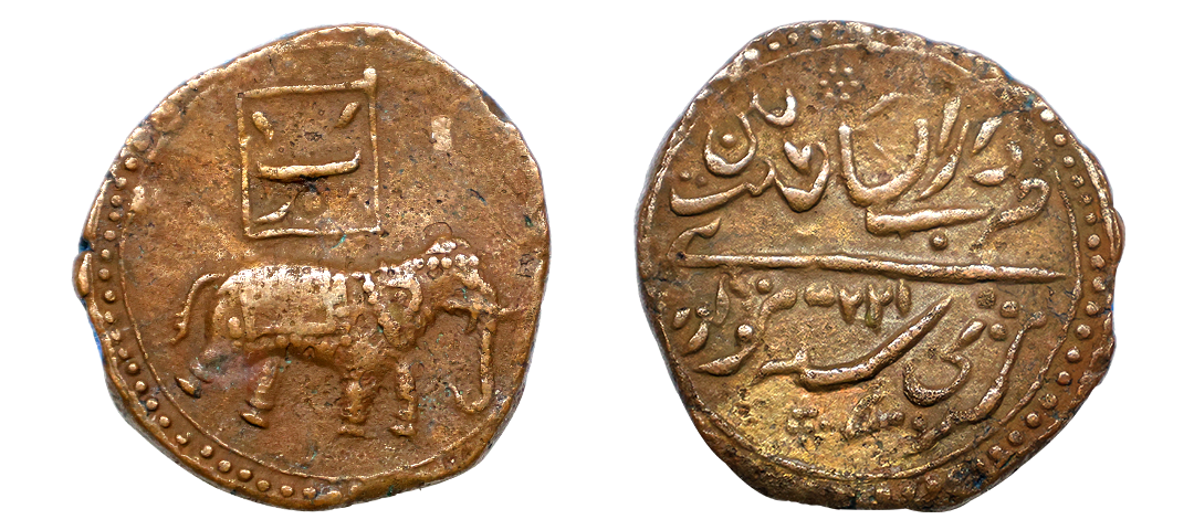 Tripura, Krishna Manikya (1760-1783 AD), silver tanka, with citing Queen Jahnavi, Sake 1582, R&B-T 254, 10.69g. Obv: Lion facing left, standard above, date below, all within a circle with an outer border of beaded annulets. Rev: Bangla legend Siva Durga Pa/de Sri Sri Yuta/Krishna manikya/Deva Sri Sri Jahna/vi Maha Devyau in five lines, within a square with ornamented border. Very fine, Extremely rare.