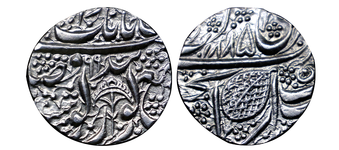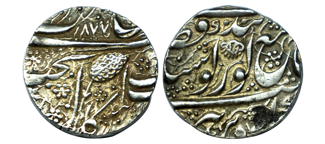Tripura, Amara Manikya, Silver Tanka, 10.69g, with title Srihatte Vijayi, citing queen Queen Amarivati obv. lion facing left, standard above, date SE 1503 below, pellets added below lion's head, rev. Srihatte Vijayi/ Sri Sri Yutamara Ma/nikya Deva Sri A/marivati Devyau (Bose- Rhodes 171). Very Fine, Rare.