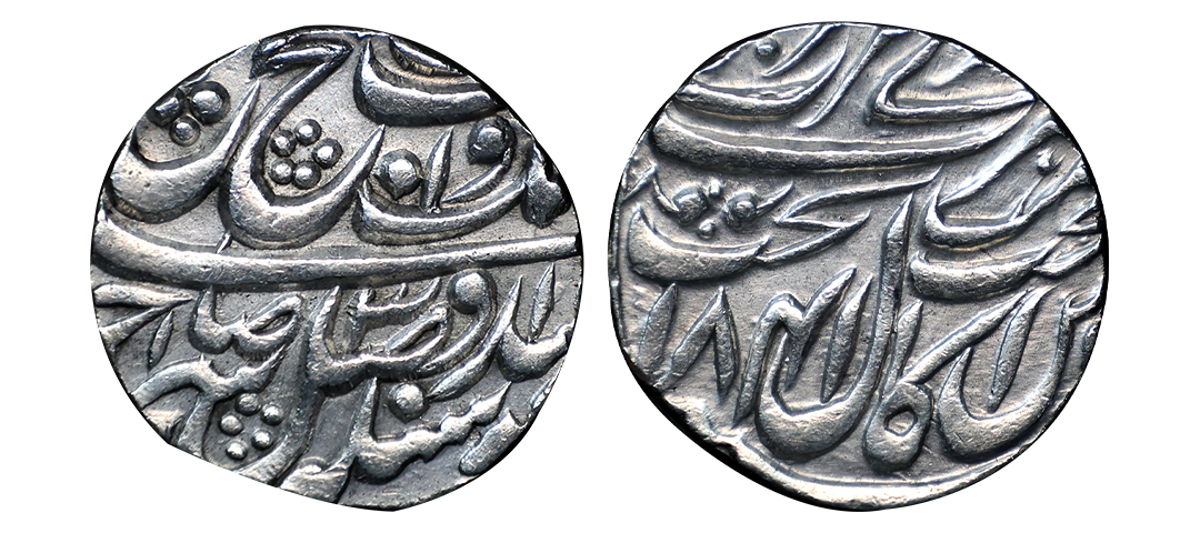 Nawabs of Bengal, INO Alamgir II (AH 1167-1173, 1755-1761 AD), Azimabad Mint (off flan), Silver ½ Rupee, 5.69 gms, AH (117)3, RY 6, Obv: Persian legend "Sikka Mubarak Badshah Ghazi alamgir", Rev: Persian legend "Sana 6 julus" with Trishul symbol as a mint mark, KM #453.1, very fine, rare. ( from the collection of Mr. I. K. Kejriwal ).