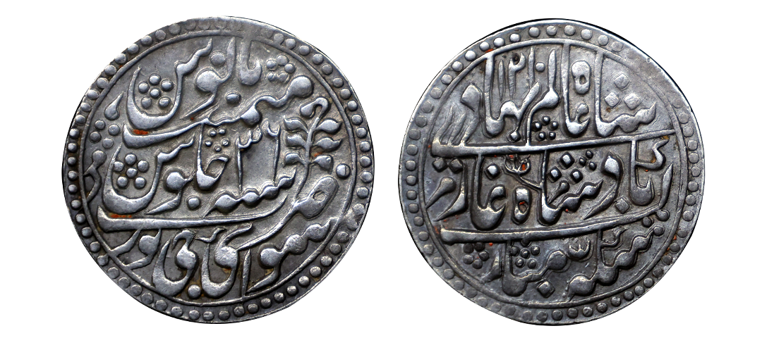Jaipur State, Sawai Jaipur Mint, Silver Nazarana Rupee, AH 1166/6 RY, In the name of Ahmad Shah Bahadur, Obv: Persian legend "Sikka Mubarak Badshah Ghazi Ahmad Shah Bahadur", Rev: Persian legend "Sana 6 julus" & "zarb Sawai Jaipur" at the bottom, (KM #9), graded by NGC as AU58, Very Rare.