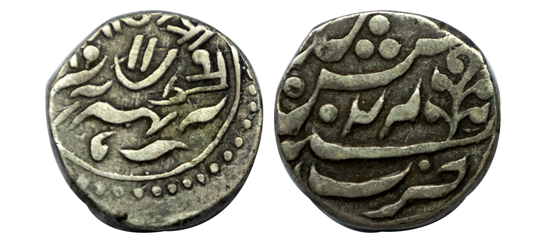 Jaipur State, Sawai Jaipur Mint, Silver Nazarana Rupee, AH 1166/6 RY, In the name of Ahmad Shah Bahadur, Obv: Persian legend "Sikka Mubarak Badshah Ghazi Ahmad Shah Bahadur", Rev: Persian legend "Sana 6 julus" & "zarb Sawai Jaipur" at the bottom, (KM #9), graded by NGC as AU58, Very Rare.