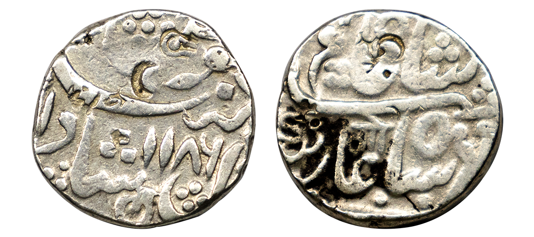 Jaipur State, Sawai Jaipur Mint, Silver Nazarana Rupee, AH 1166/6 RY, In the name of Ahmad Shah Bahadur, Obv: Persian legend "Sikka Mubarak Badshah Ghazi Ahmad Shah Bahadur", Rev: Persian legend "Sana 6 julus" & "zarb Sawai Jaipur" at the bottom, (KM #9), graded by NGC as AU58, Very Rare.